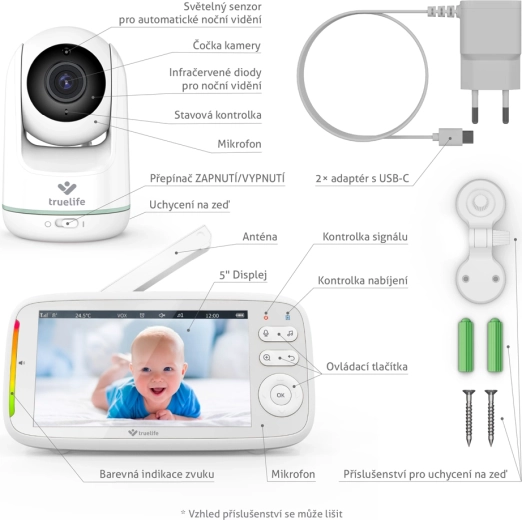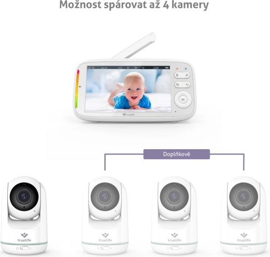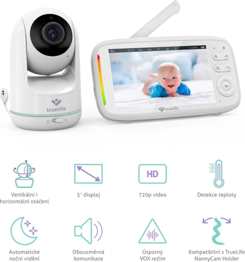 TrueLife NannyCam R5 est un babyphone vidéo fiable pour les parents modernes. La caméra motorisée avec un angle horizontal de 330° et vertical de 135°, combinée à un objectif grand angle, couvre toute la pièce, tandis que la résolution HD 720p garantit une image nette et précise sur l’écran IPS LCD 5". La vision nocturne automatique avec LED infrarouges s’active seule, afin que vous voyiez votre bébé même dans l’obscurité totale.