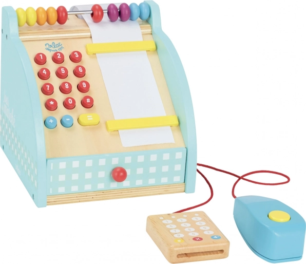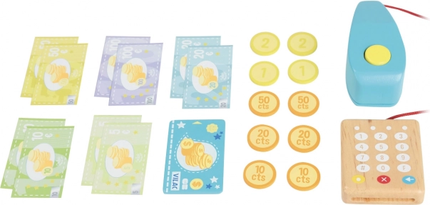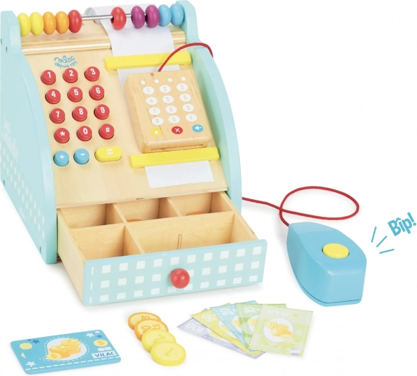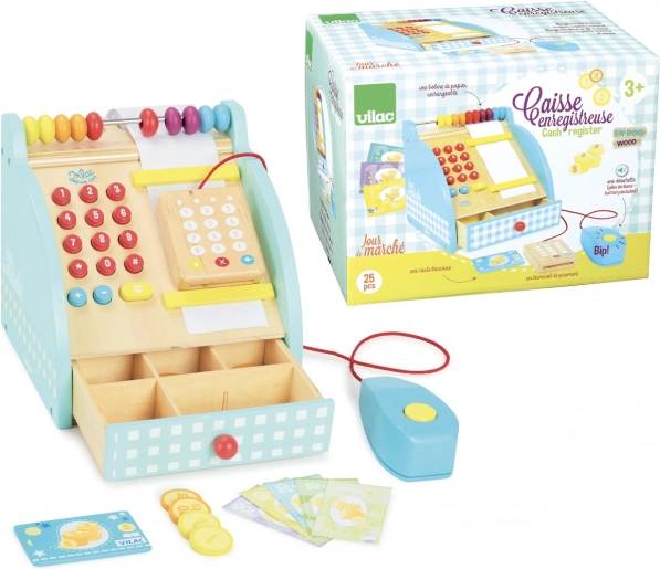 La caisse enregistreuse en bois VILAC au style élégant ravira les petits vendeurs et vendeuses. Elle offre un clavier numérique fonctionnel, un tiroir-caisse, un compteur et un terminal bancaire. Sont inclus également des billets et pièces ainsi qu’un bouton sonore classique qui donne plus d’authenticité au jeu.