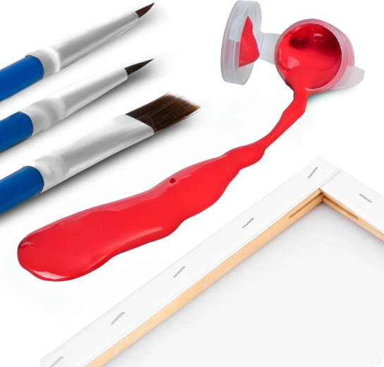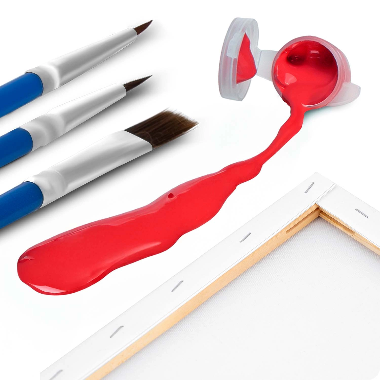 Coffret complet pour peindre immédiatement – toile apprêtée sur châssis, jusqu’à 30 peintures acryliques intenses, 3 pinceaux de tailles différentes et quincaillerie de suspension.