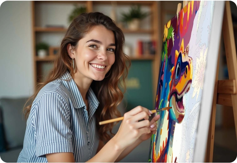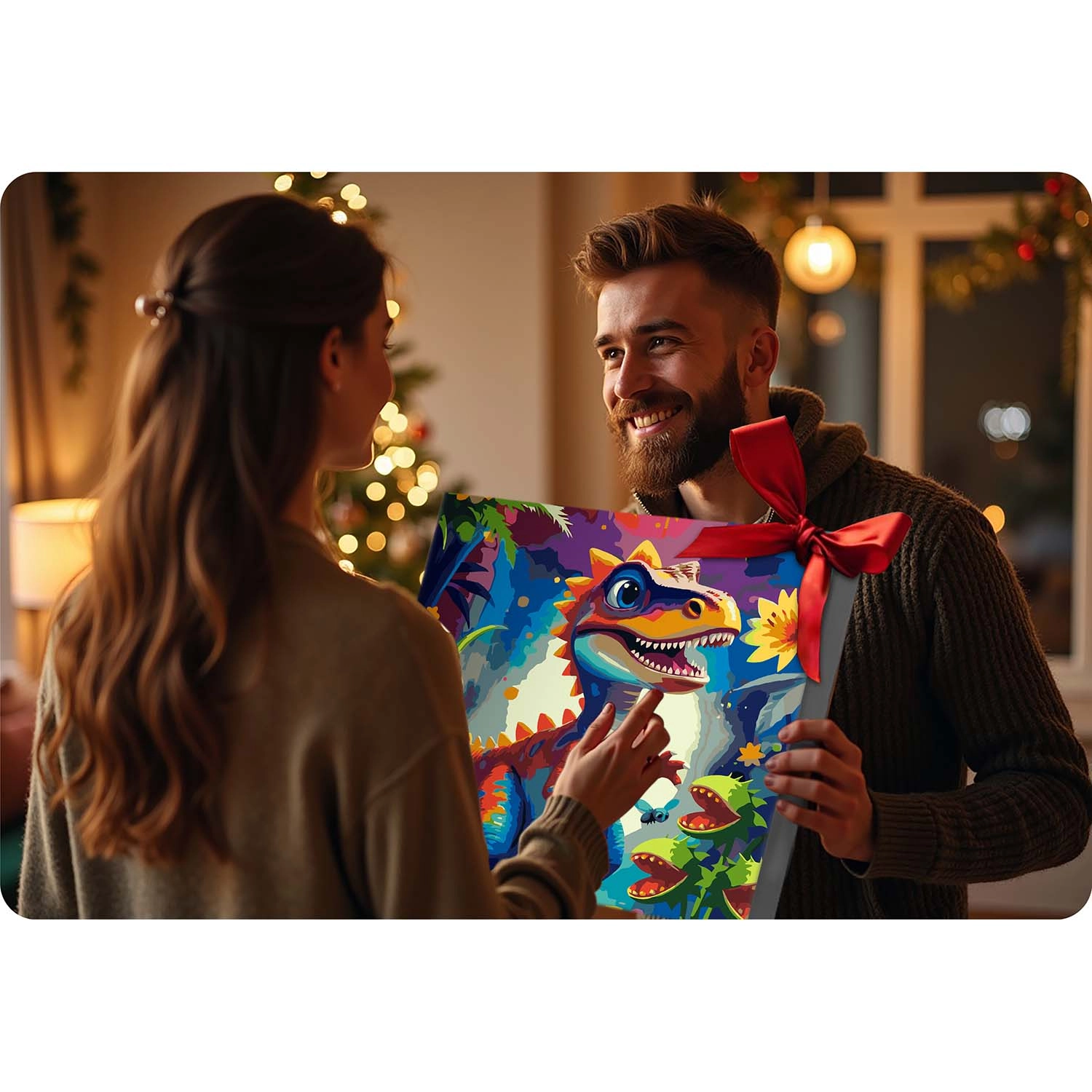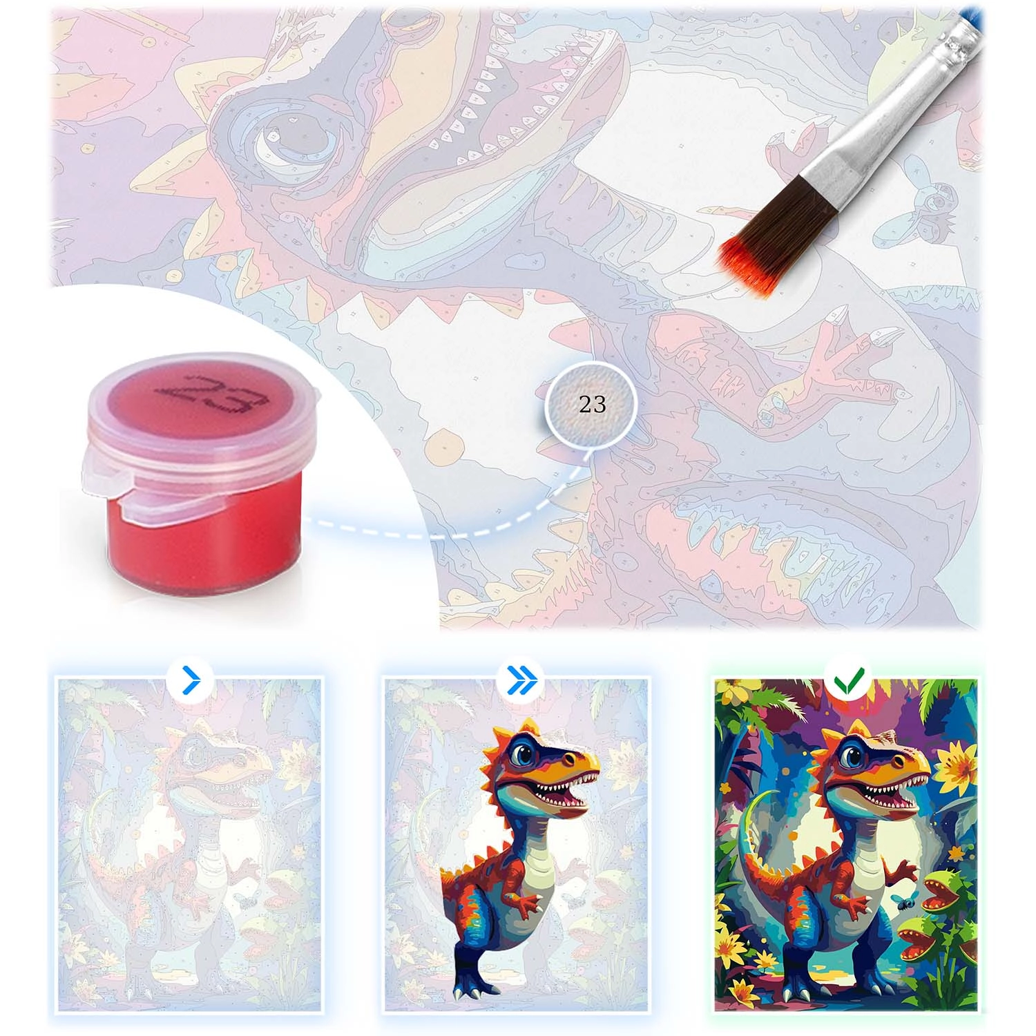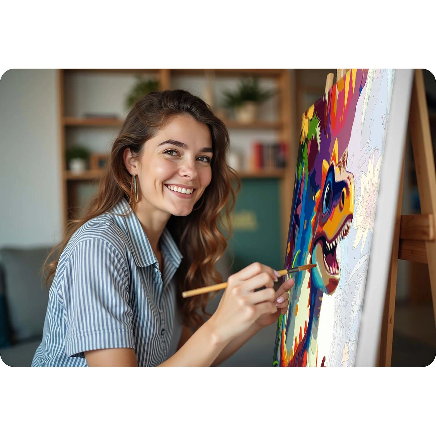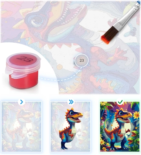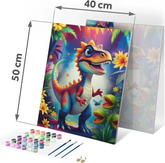 Découvrez la joie de créer avec la peinture par numéros 40 × 50 cm au motif dinosaure. Le set comprend tout le nécessaire : toile apprêtée sur châssis, jusqu’à 30 peintures acryliques opaques, 3 pinceaux de tailles variées et crochets de suspension. Grâce à la sous-couche colorée aux lignes fines, même les débutants réussiront leur peinture et le résultat offrira des couleurs intenses et une couverture totale sans lignes visibles.