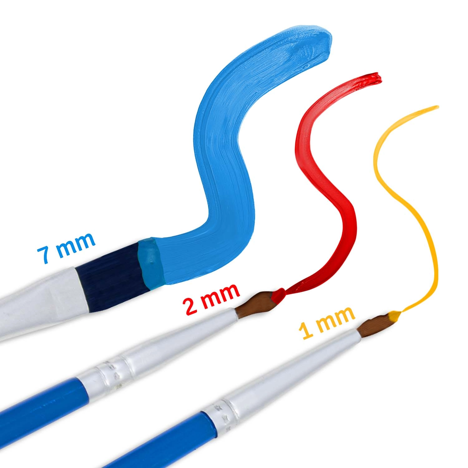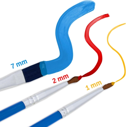 Trois pinceaux (1 mm, 2 mm et 7 mm) couvrent les grandes surfaces comme les plus petits détails. Les peintures denses et opaques assurent une couverture totale sans laisser transparaître les lignes.