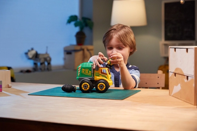 La dépanneuse jaune avec des pièces fonctionnelles est idéale pour les premiers vissages. Les enfants entraînent leur coordination puis partent aussitôt secourir les voitures en panne.