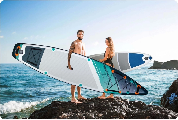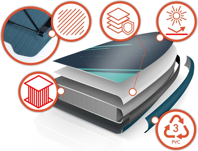 Le PVC triple couche, les coutures renforcées et le renfort de rail assurent rigidité, durabilité et longévité. Le revêtement EVA antidérapant est confortable et résistant aux UV.
