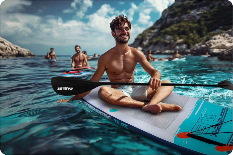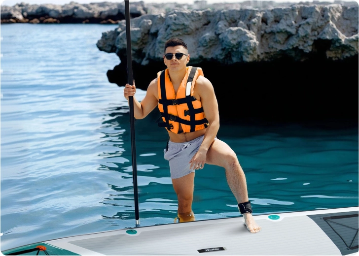 Le pack contient tout le nécessaire pour partir immédiatement : pompe manuelle, pagaie en aluminium réglable, leash de sécurité, aileron central amovible, kit de réparation, sac à dos et siège avec dossier et poche en bonus pour pagayer confortablement en position assise. Un choix idéal pour la détente, le fitness et les excursions.
