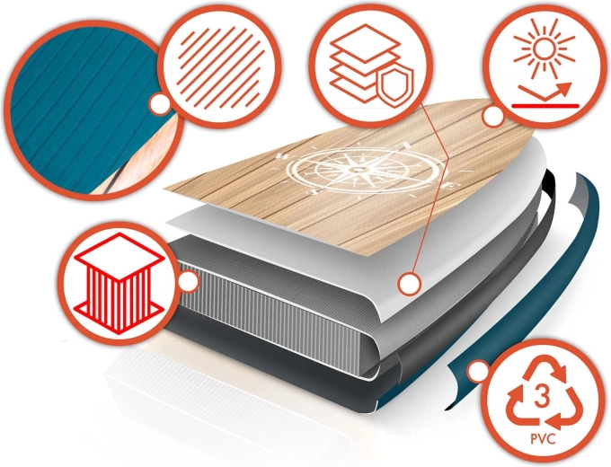 Le tissu double Drop Stitch, le PVC triple couche et les coutures renforcées assurent une excellente rigidité, une grande durabilité et un poids réduit. Idéal pour les longues balades comme pour une utilisation quotidienne.