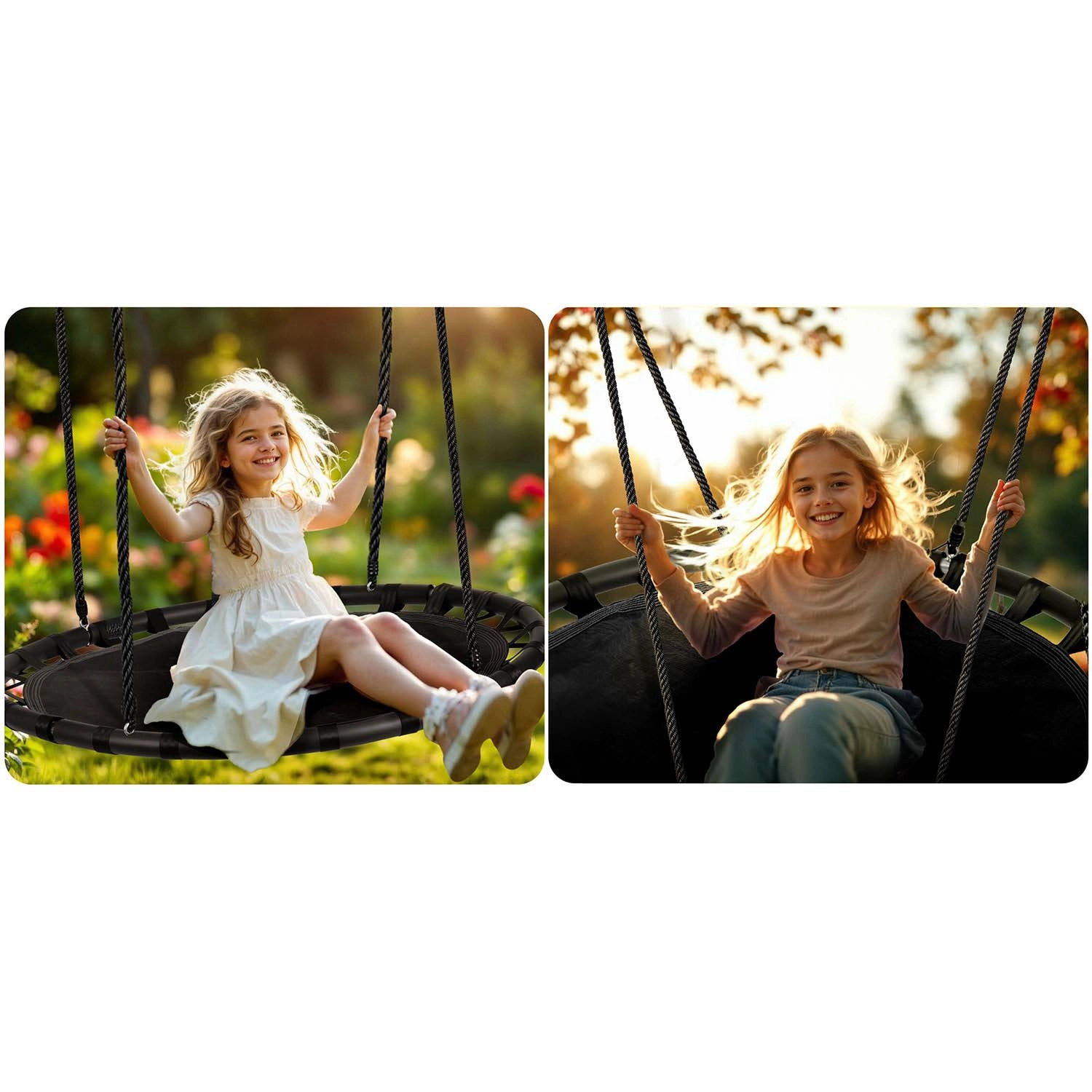 Grâce aux cordes tressées robustes avec réglage fluide de la hauteur, vous adaptez aisément la balançoire à la taille de l’enfant ou au point d’ancrage. Le diamètre de 110 cm offre suffisamment d’espace pour s’asseoir ou s’allonger, et la charge de 150 kg permet à plusieurs enfants de se balancer en même temps.