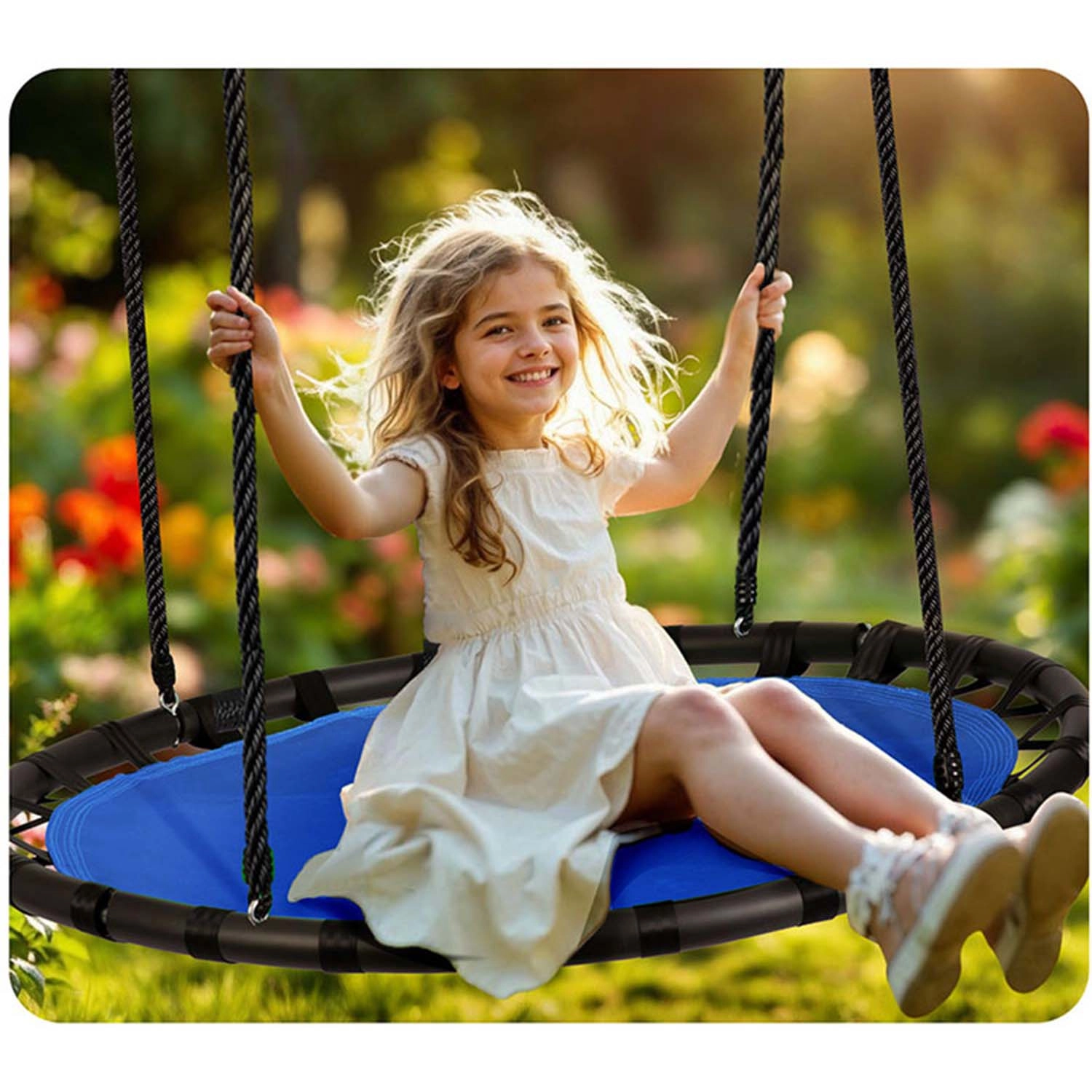 La balançoire dispose d’un réglage progressif de la hauteur jusqu’à 160 cm, ce qui permet de l’adapter aisément à la taille et à l’âge de l’enfant – elle grandit avec lui. Grâce à son grand diamètre de 120 cm, un ou plusieurs enfants peuvent s’y balancer confortablement, et vous pouvez aussi en profiter pour vous détendre – capacité de charge jusqu’à 150 kg.
