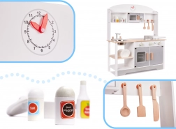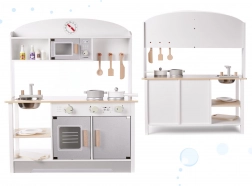 Une cuisine pour enfants élégante en MDF aux couleurs neutres offre des heures de jeu créatif. Elle comprend un évier métallique amovible, des plaques de cuisson avec boutons rotatifs, un four avec hublot et affichage, un micro-ondes et un égouttoir à vaisselle. Livrée avec de nombreux accessoires en bois (casserole, poêle, assiettes, couteau, cuillère, spatule, pots à épices) et de pratiques crochets et étagères pour le rangement. Sûre, avec surfaces lisses poncées et peintes avec des peintures non toxiques.