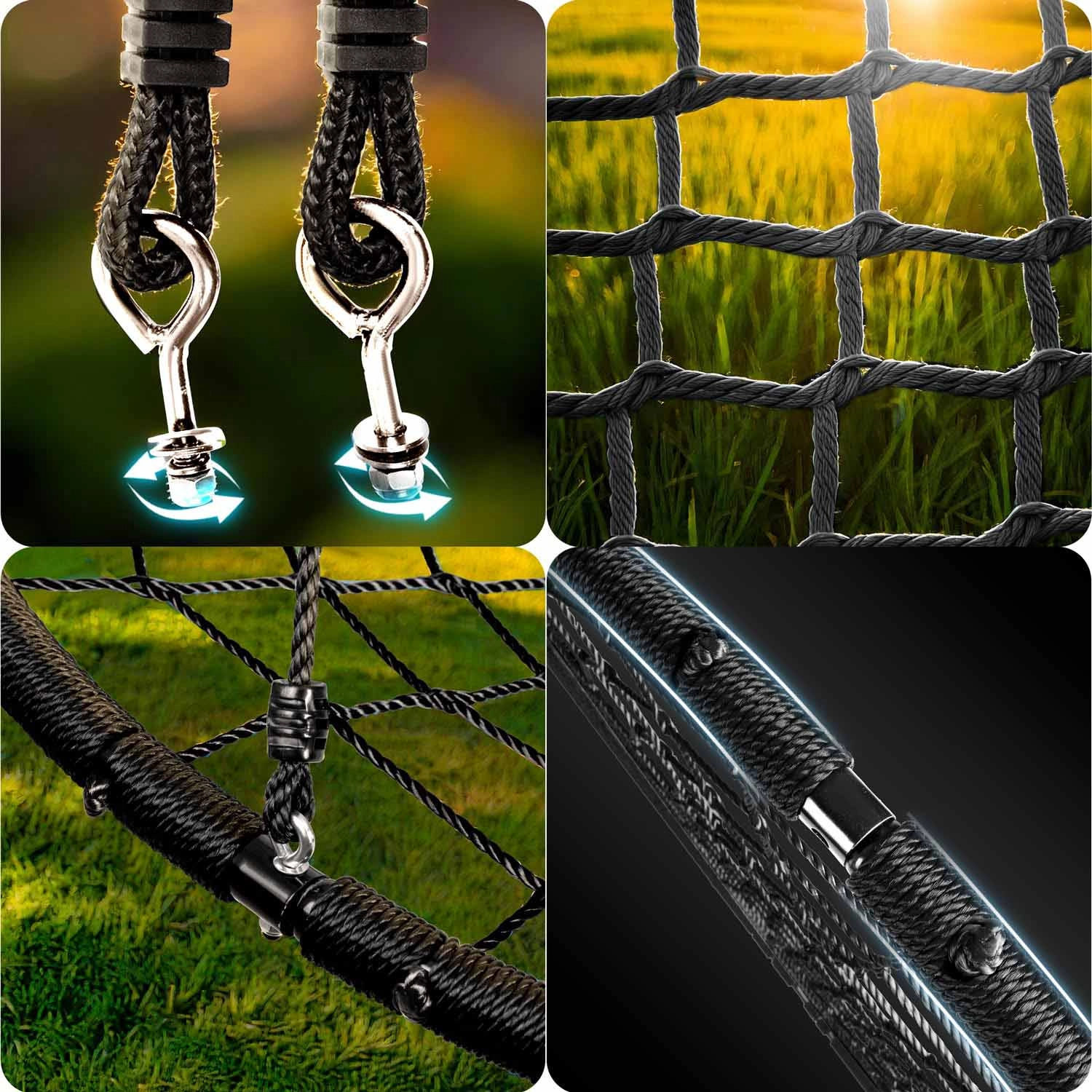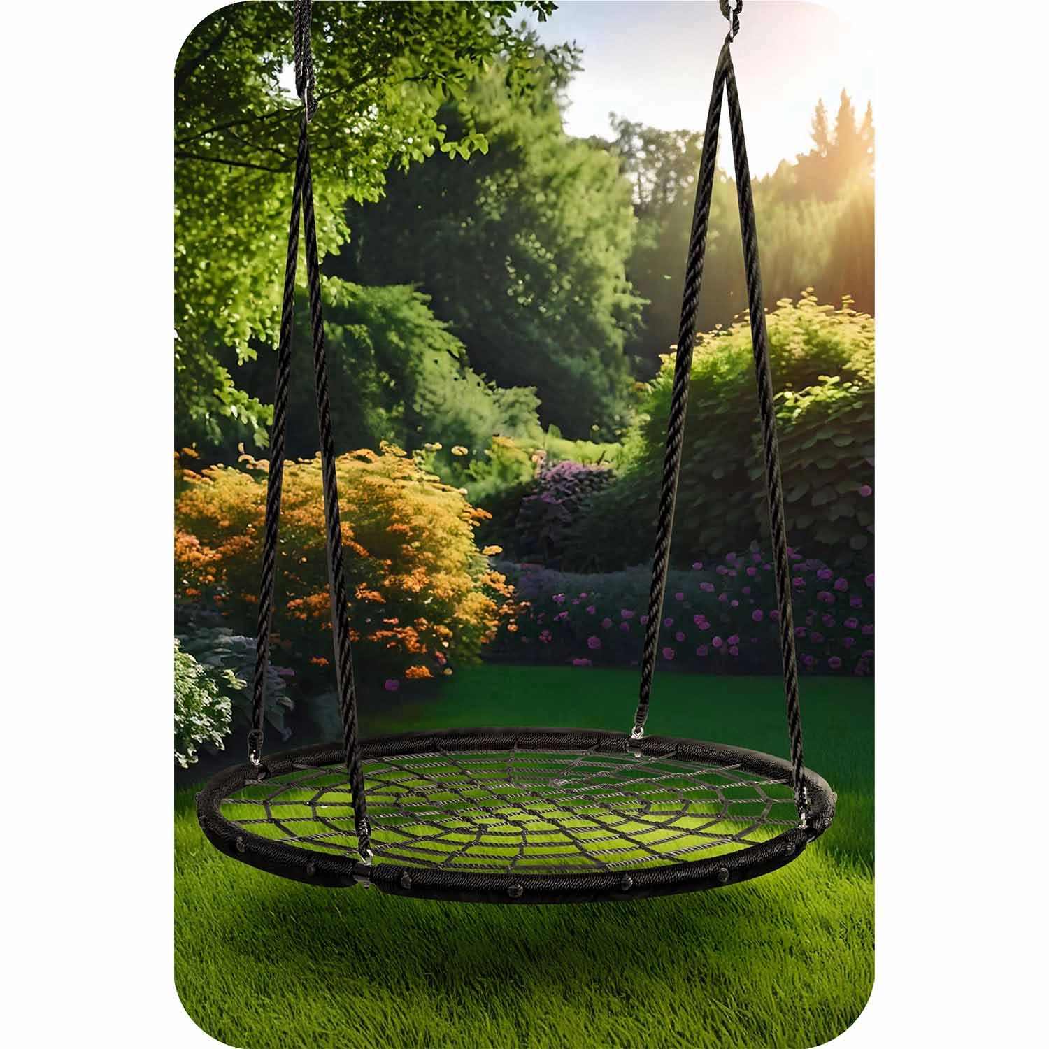 La balançoire NEO-SPORT de 100 cm de diamètre est un excellent choix pour le jardin, la terrasse ou l’aire de jeux. Sa structure à cadre en acier gainée de PE résistant et son solide cordage tressé façon toile d’araignée offrent une assise confortable et sécurisée. Les matériaux résistent aux intempéries, se nettoient facilement et conviennent à un usage quotidien.