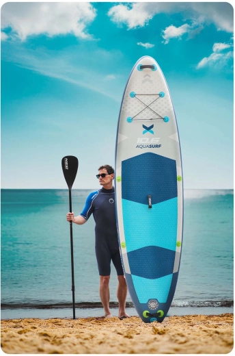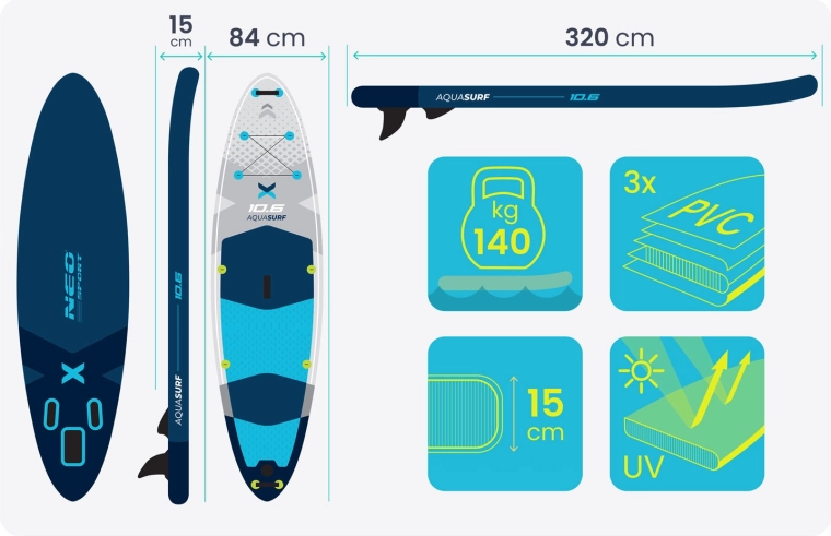 Le paddleboard AQUASURF 10’6 offre une combinaison idéale de stabilité, maniabilité et résistance. Avec 15 cm d’épaisseur et une capacité jusqu’à 140 kg, il est parfait pour débutants comme confirmés, pour la détente, le fitness ou le yoga sur l’eau. La mousse EVA antidérapante maintient fermement les pieds même mouillés, tandis que trois ailerons (principal amovible + latéraux) améliorent la trajectoire et la stabilité en ligne droite.