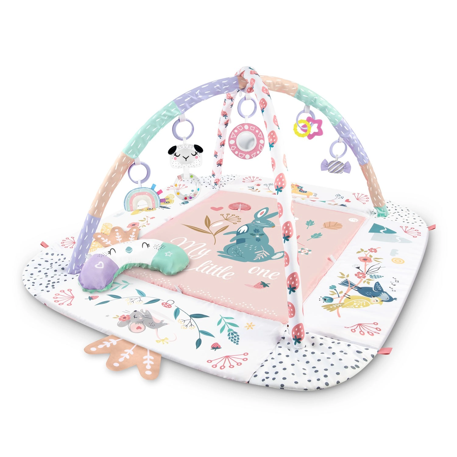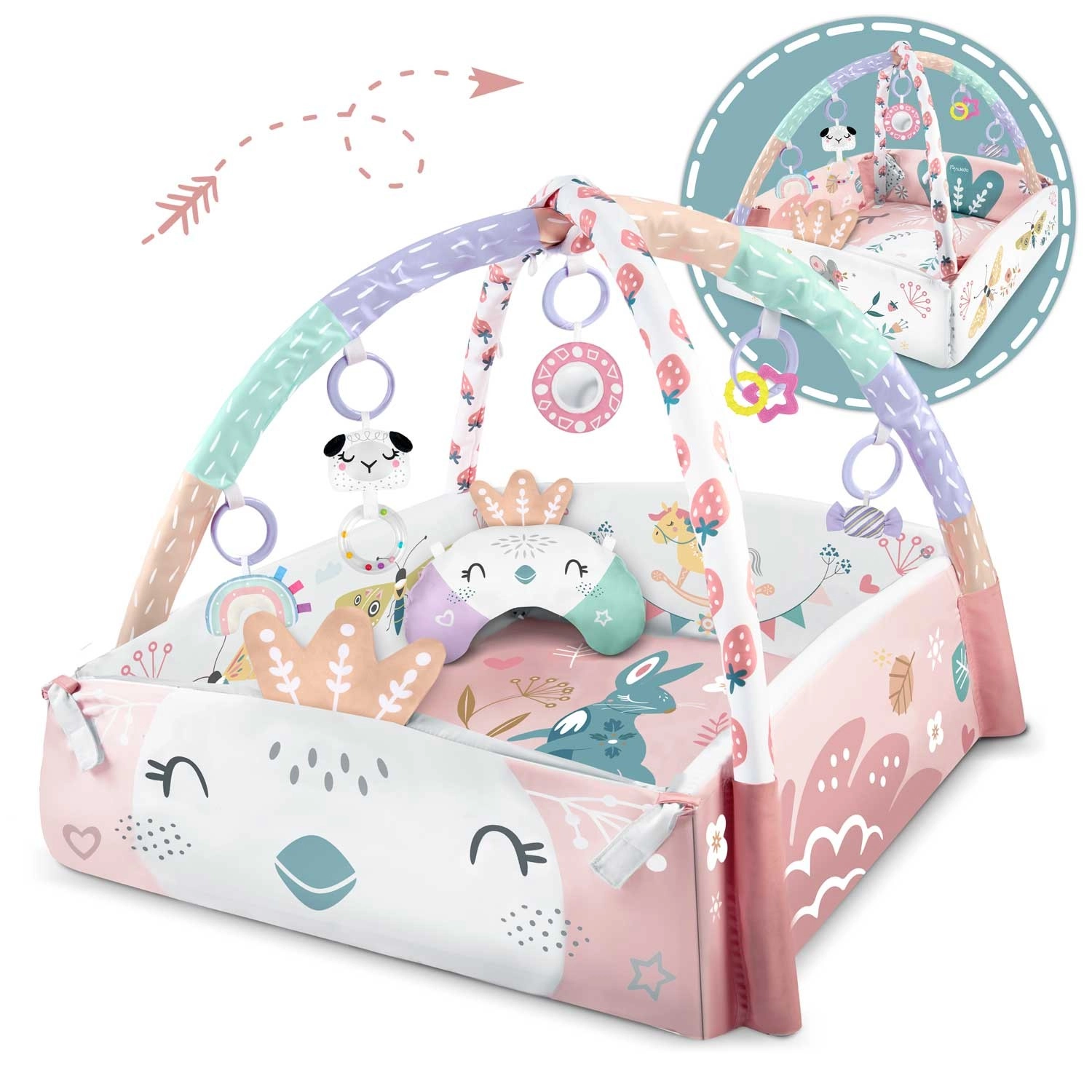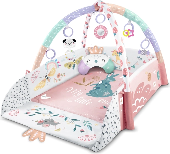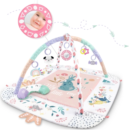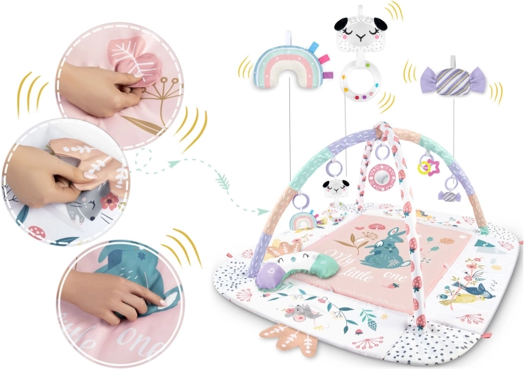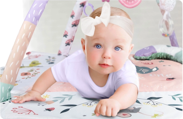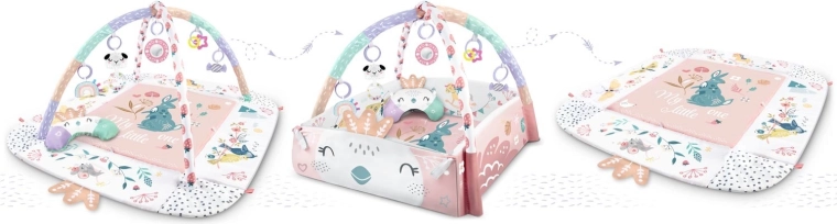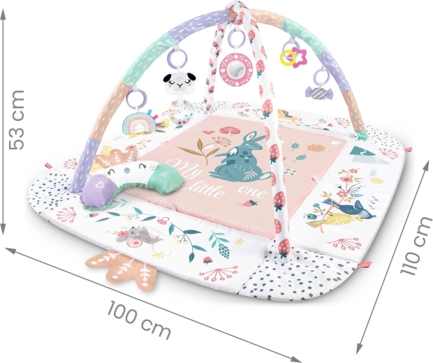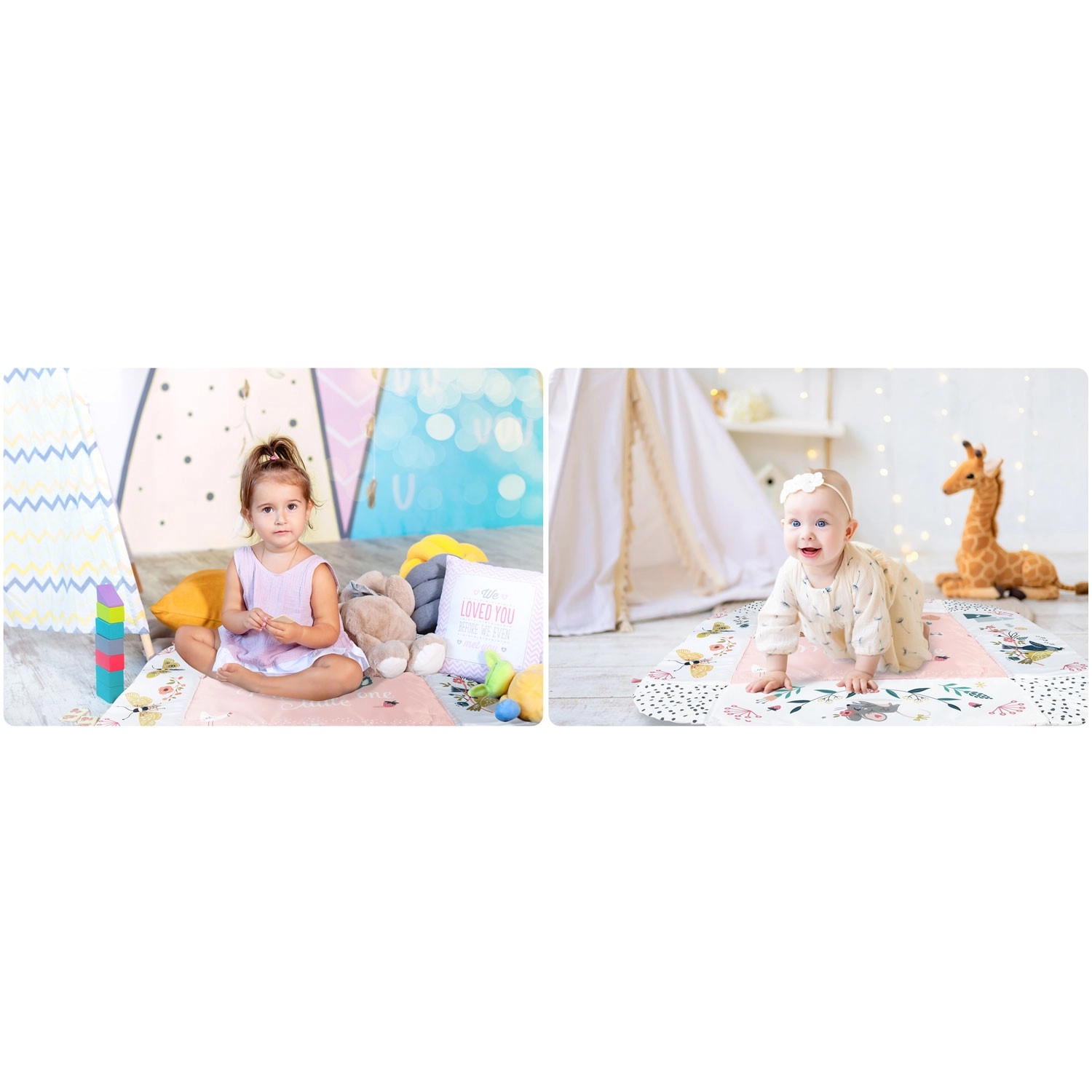 La matière est douce, résistante et facile à nettoyer, la face inférieure isole parfaitement du froid. Les graphismes pastel et réversibles à motifs d’animaux créent une atmosphère agréable pour le jeu quotidien et le repos. Grâce aux arches amovibles et réglables en hauteur et aux bandes astucieuses à velcro, les jouets se déplacent et s’adaptent facilement à l’étape de développement de l’enfant.