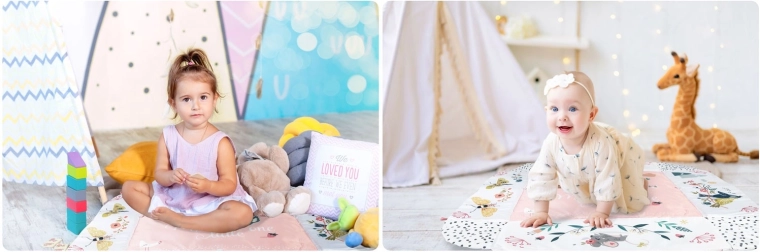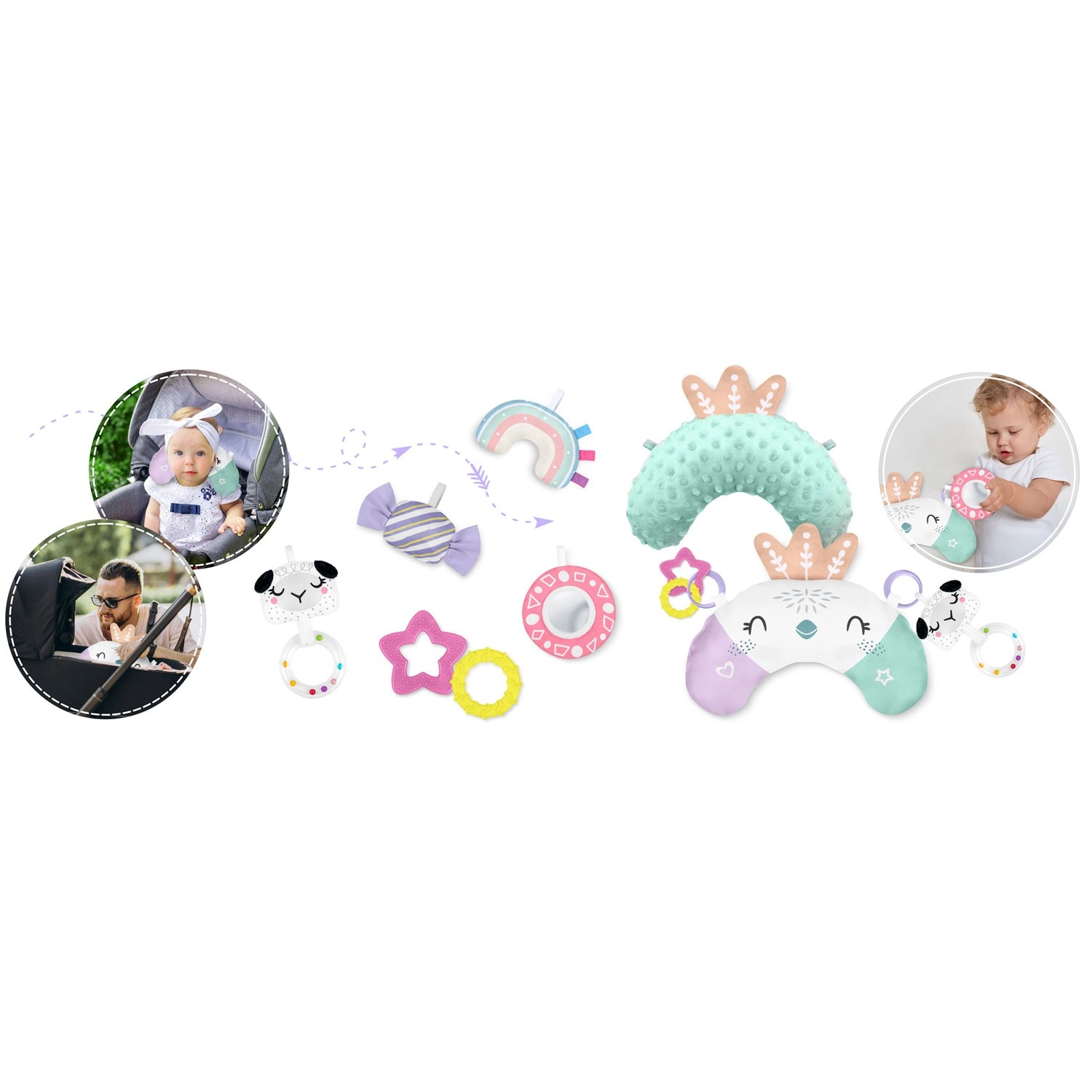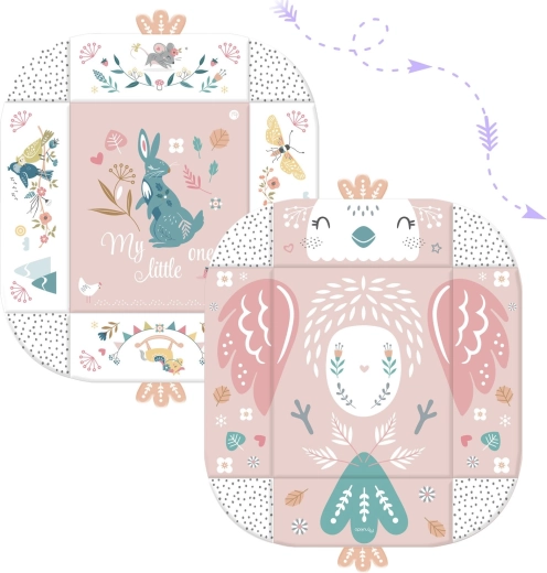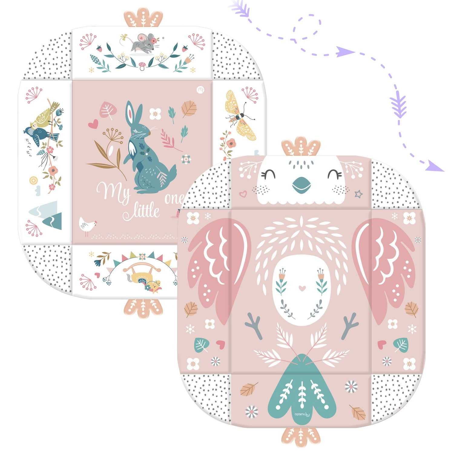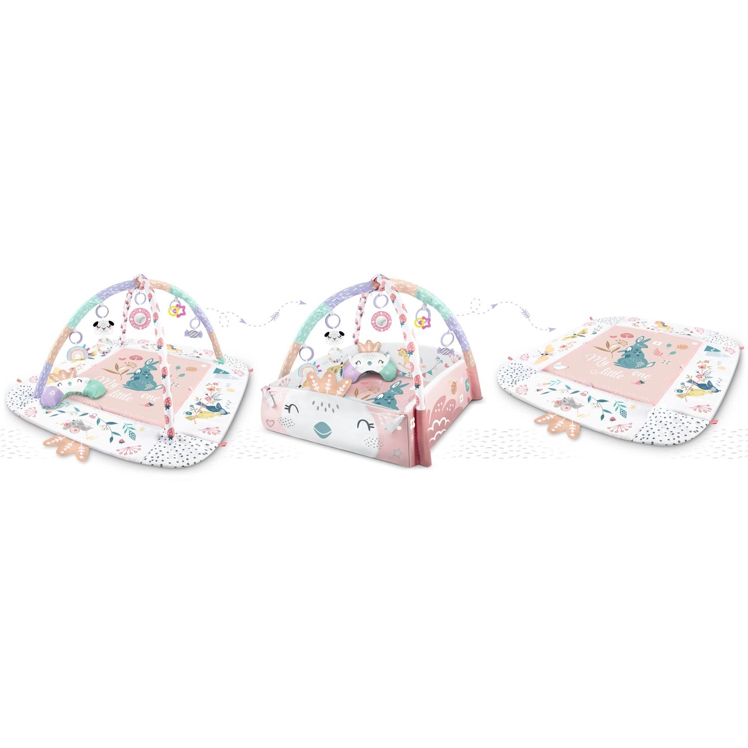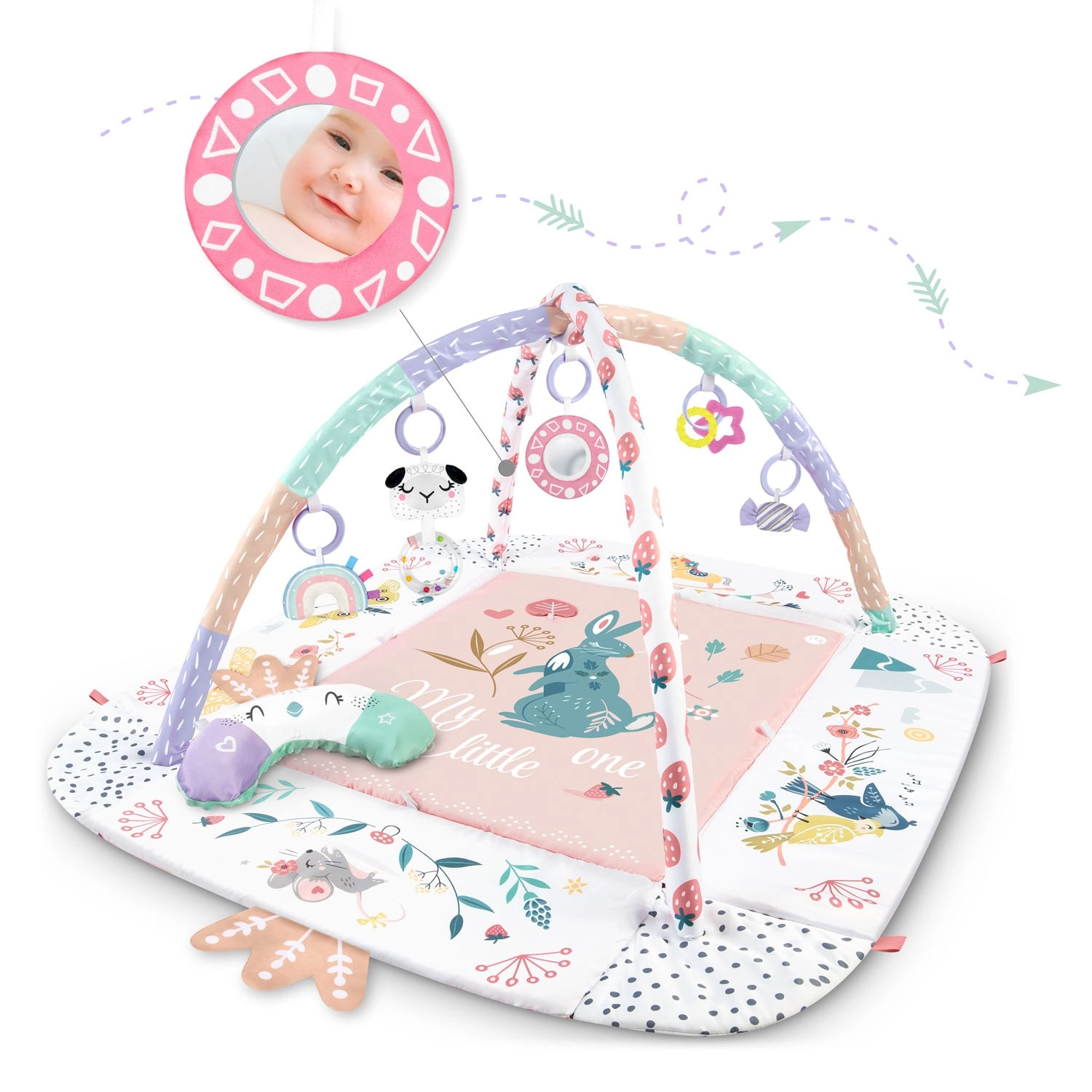 La matière est douce, résistante et facile à nettoyer, la face inférieure isole parfaitement du froid. Les graphismes pastel et réversibles à motifs d’animaux créent une atmosphère agréable pour le jeu quotidien et le repos. Grâce aux arches amovibles et réglables en hauteur et aux bandes astucieuses à velcro, les jouets se déplacent et s’adaptent facilement à l’étape de développement de l’enfant.