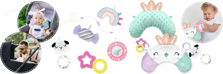 Un miroir en matériau sécurisé incassable, des hochets, éléments bruissants, une petite brebis qui couine et des anneaux de dentition stimulent la vue, l’ouïe, le toucher et la préhension.