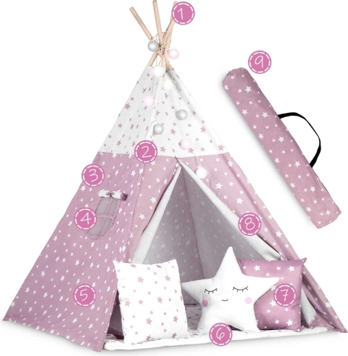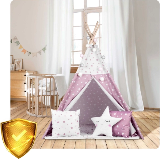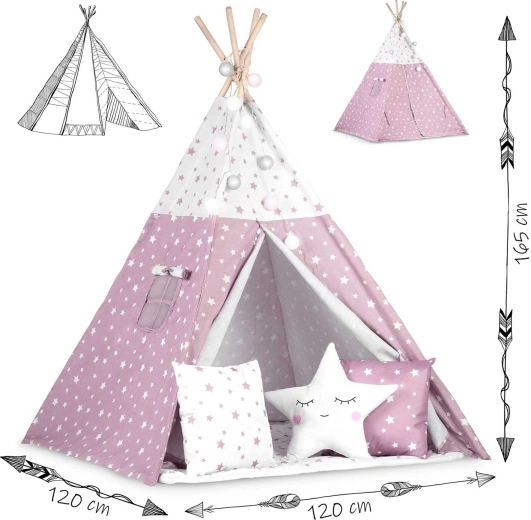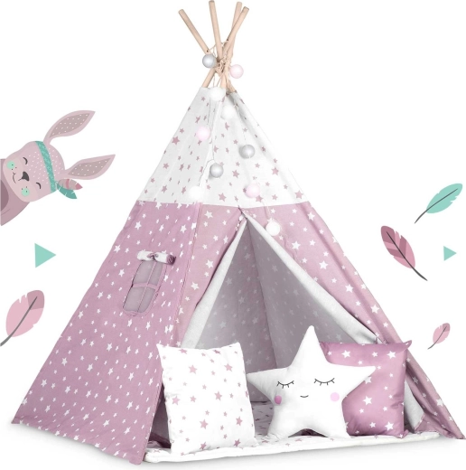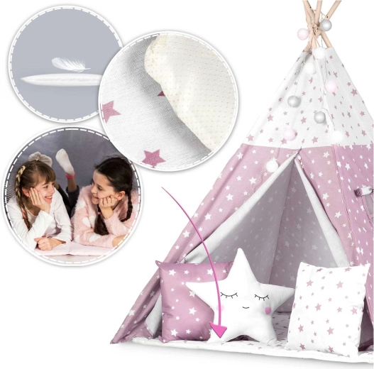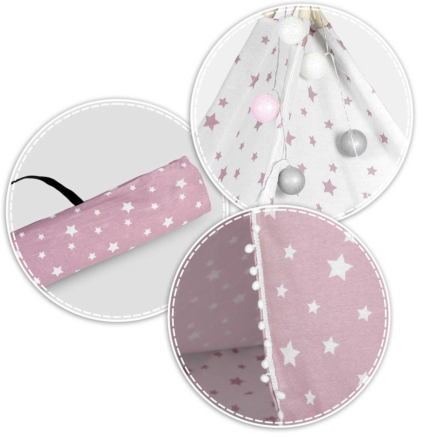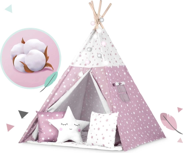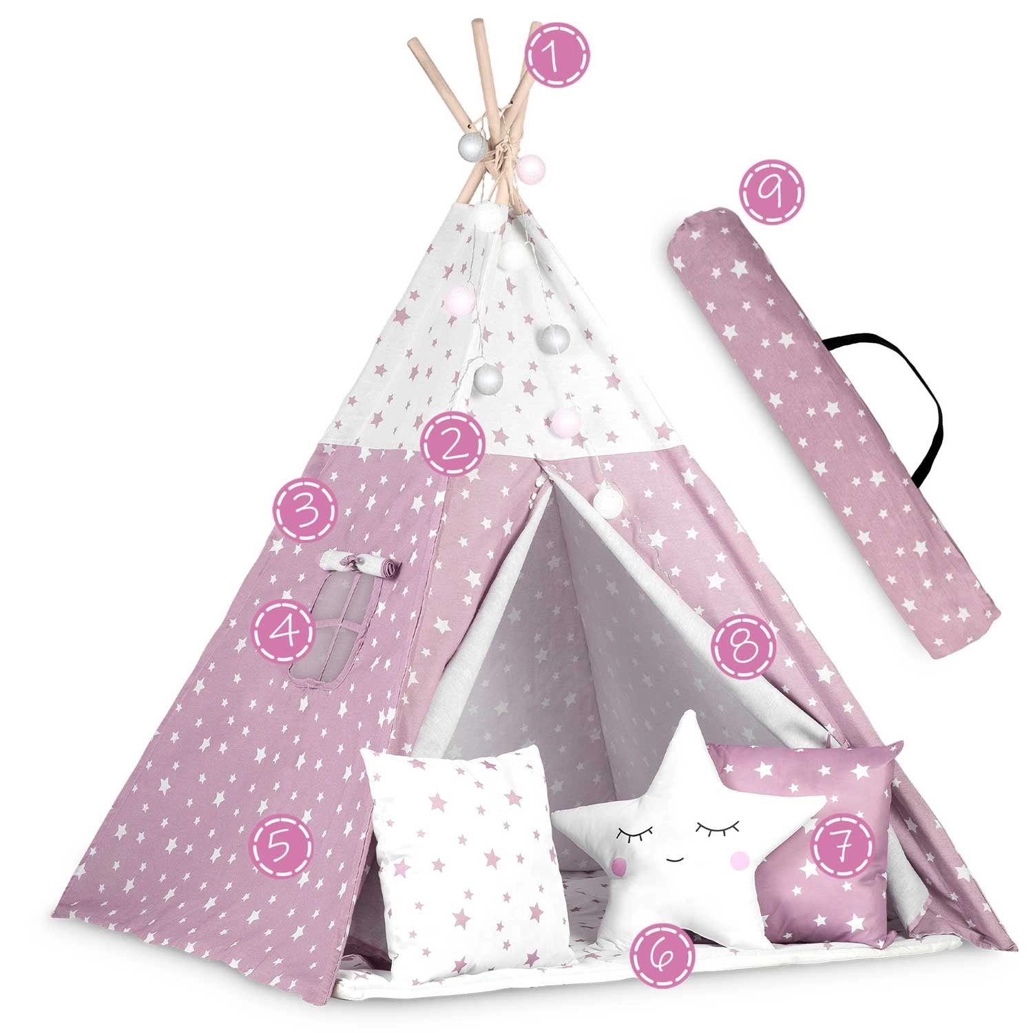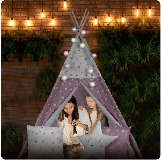 Le coffret inclut un tapis isolant moelleux avec picots antidérapants et trois coussins décoratifs qui assurent le confort pour lire ou se reposer. Grâce aux guirlandes LED à piles, créez en un instant une atmosphère magique. Le tipi se plie et se transporte facilement, et grâce à la housse fournie, vous pouvez le ranger ou l’emporter sur la terrasse ou à l’ombre du jardin.