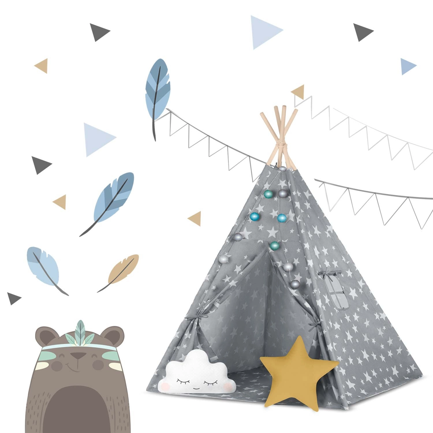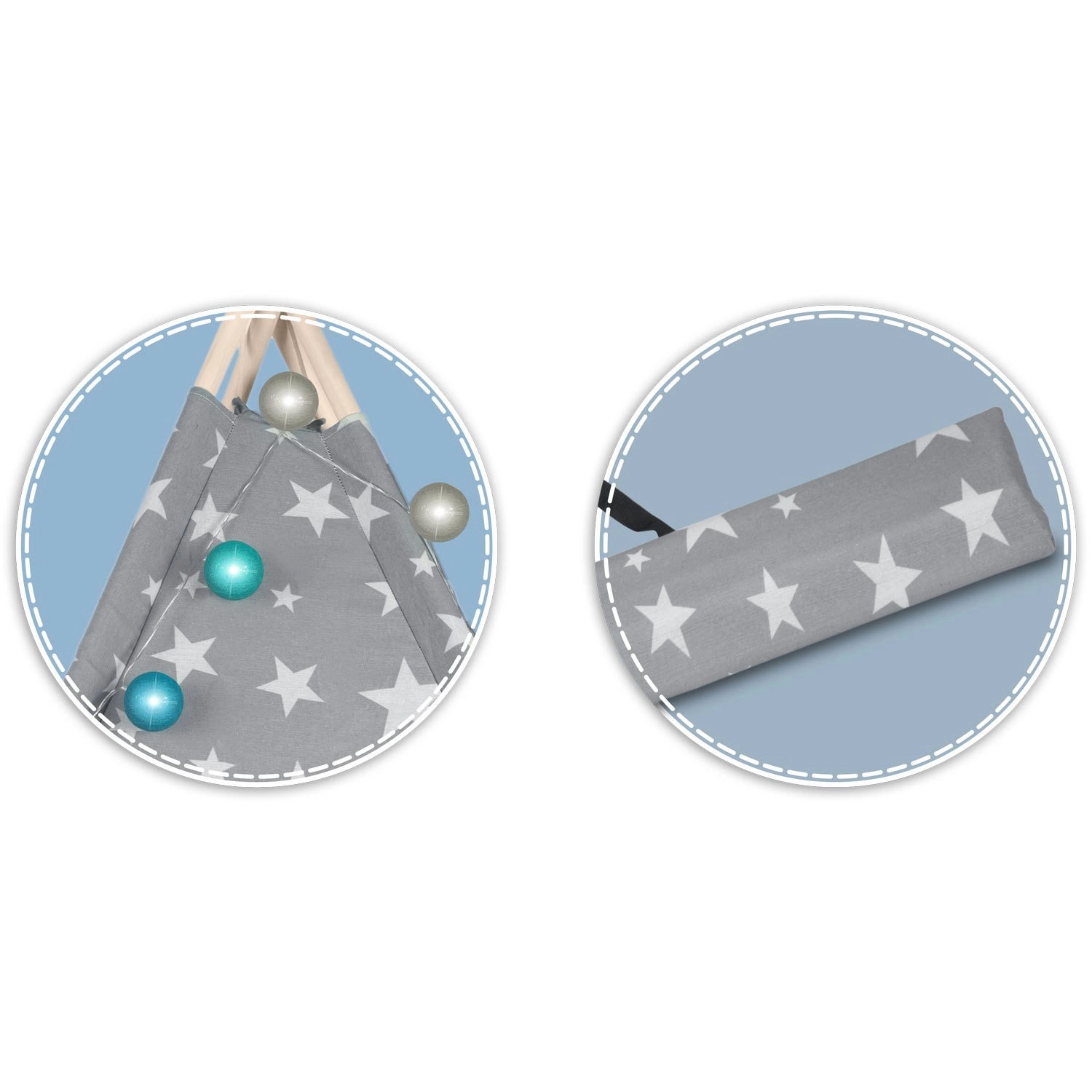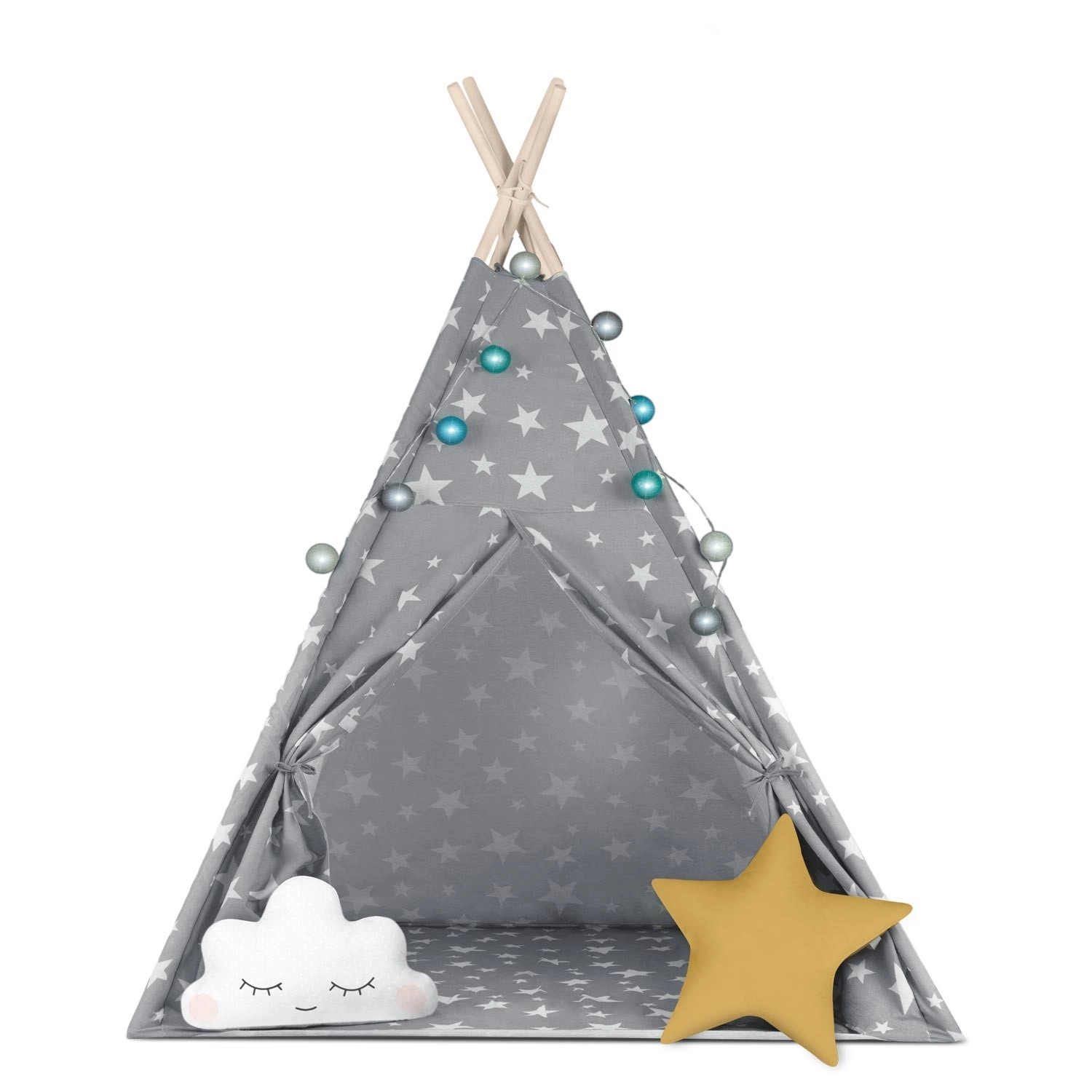 Tout le nécessaire est inclus: 4 mâts en pin, stabilisateur pour une solidité accrue, lumières LED (à piles), plancher intégré, 2 coussins moelleux en forme de nuage et d’étoile, fenêtre avec store et housse de transport pratique. Le teepee se plie et se transporte facilement – parfait pour la chambre d’enfant, le coin jeu et le jardin à l’ombre.