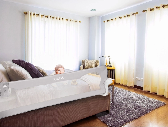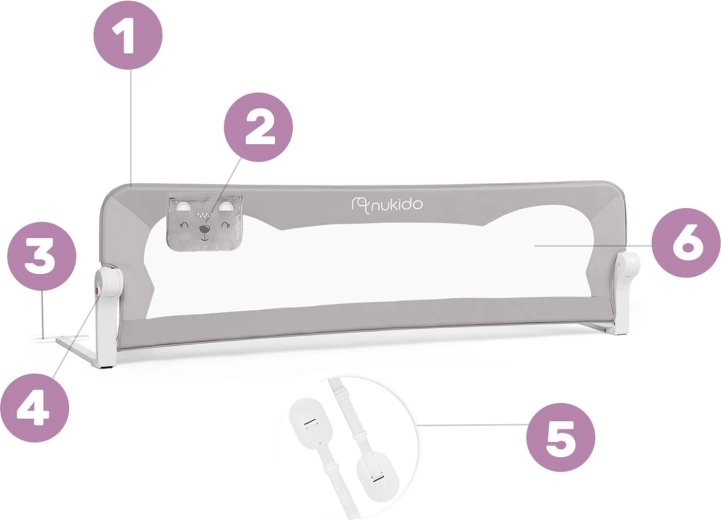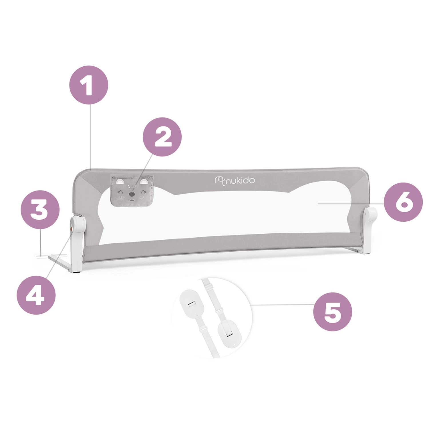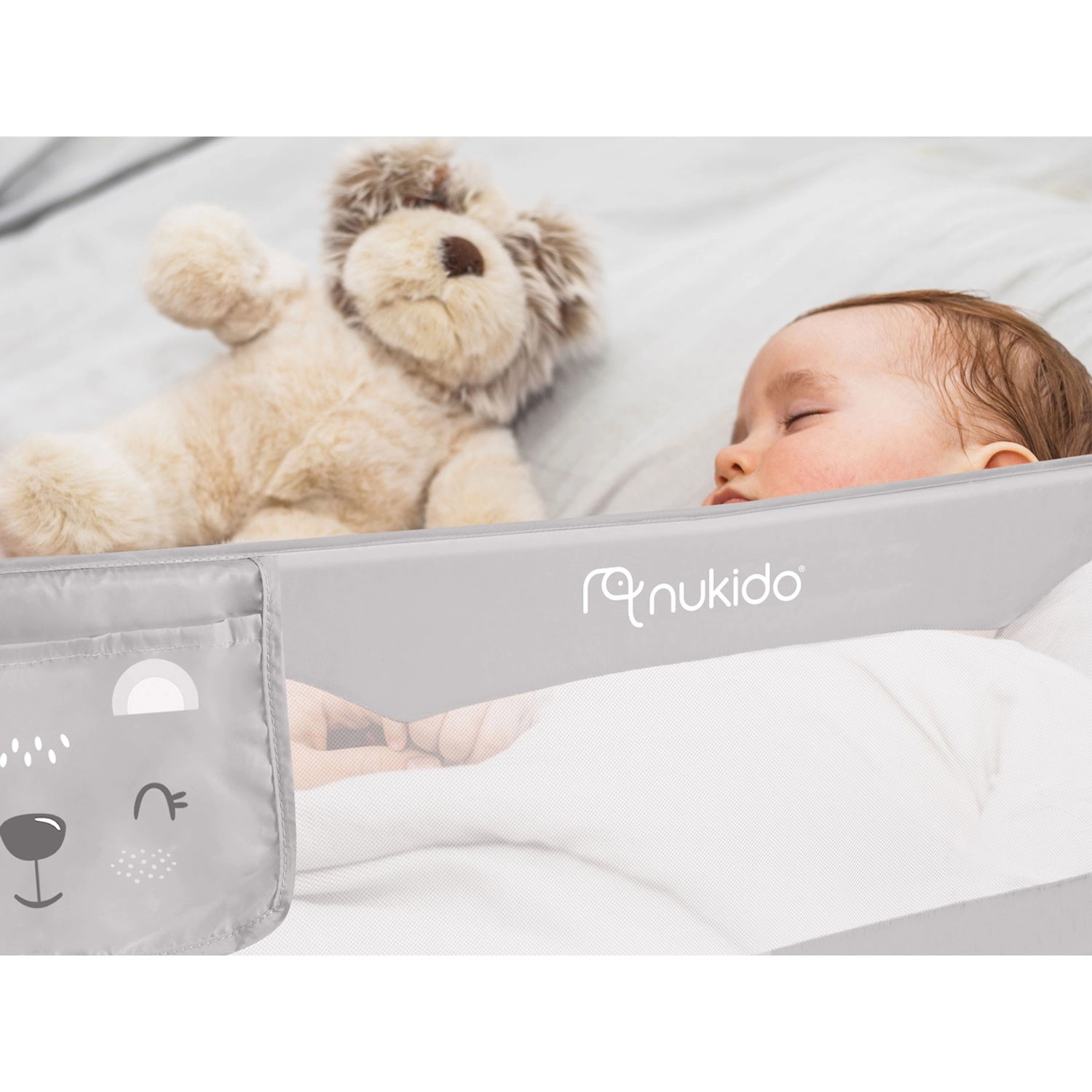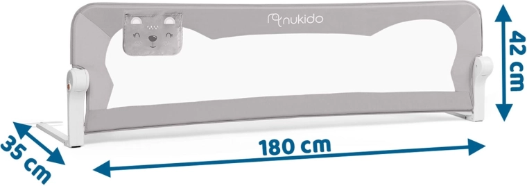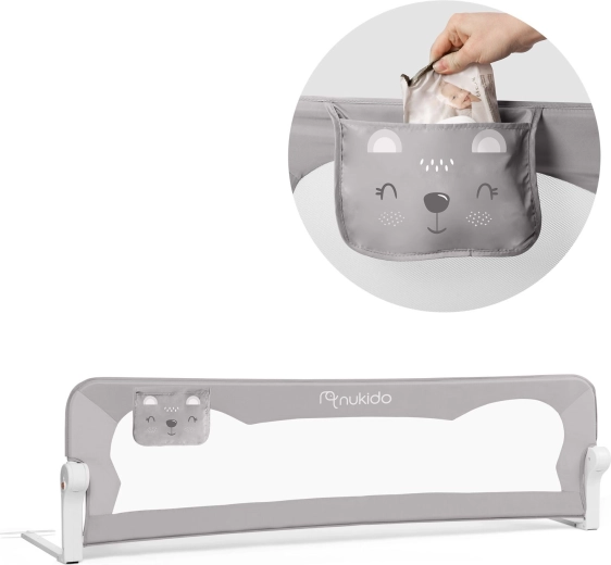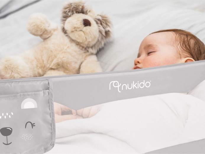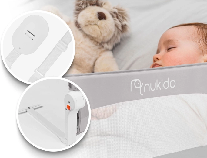 La barrière de lit Nukido, sûre et pratique, protège l’enfant contre les chutes du lit tout en permettant un contrôle aisé grâce à sa maille respirante. Elle possède un cadre en acier robuste, un rabattement jusqu’à 180° avec verrou de sécurité contre le basculement involontaire, une installation rapide sur le cadre du lit et des sangles SafetyBelt pour une stabilité accrue. Une poche pratique pour petits objets garde l’essentiel à portée de main. Conforme à la norme BS 7972:2001+A1:2009.
