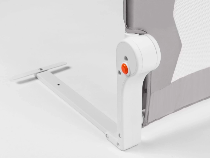 La barrière se rabat facilement pour accéder au lit. Le système de blocage empêche un pliage accidentel pendant le sommeil ou le jeu.
