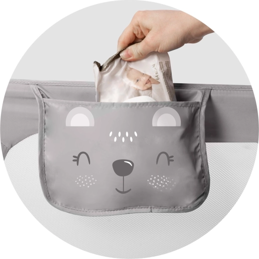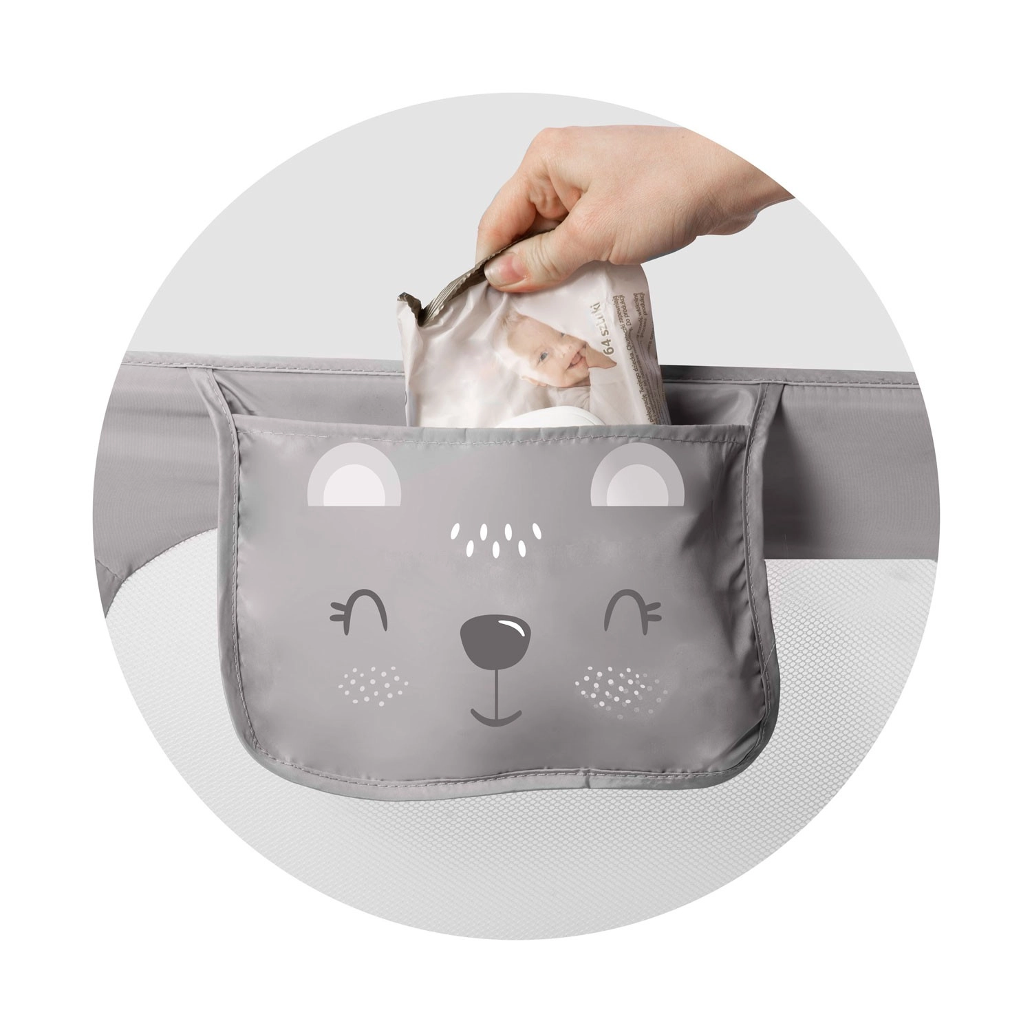 L’installation est rapide et flexible : la barrière peut être fixée directement au cadre du lit avec des vis ou sécurisée à l’aide des sangles SafetyBelt – pour une stabilité maximale, il est possible de combiner les deux méthodes. Le verrou de sécurité empêche tout pliage involontaire pendant l’utilisation, et la poche pratique garde tétine, lingettes ou petits jouets toujours à portée de main.