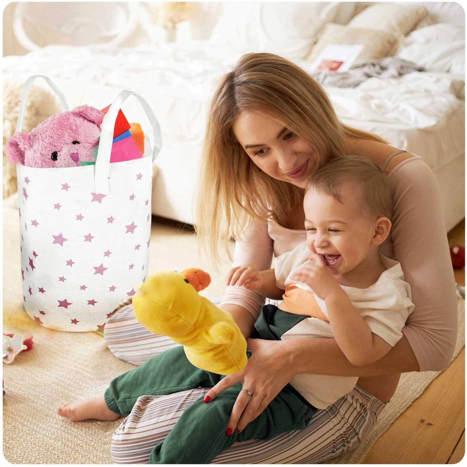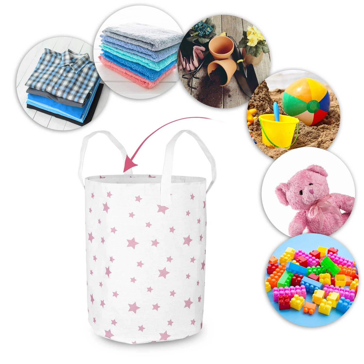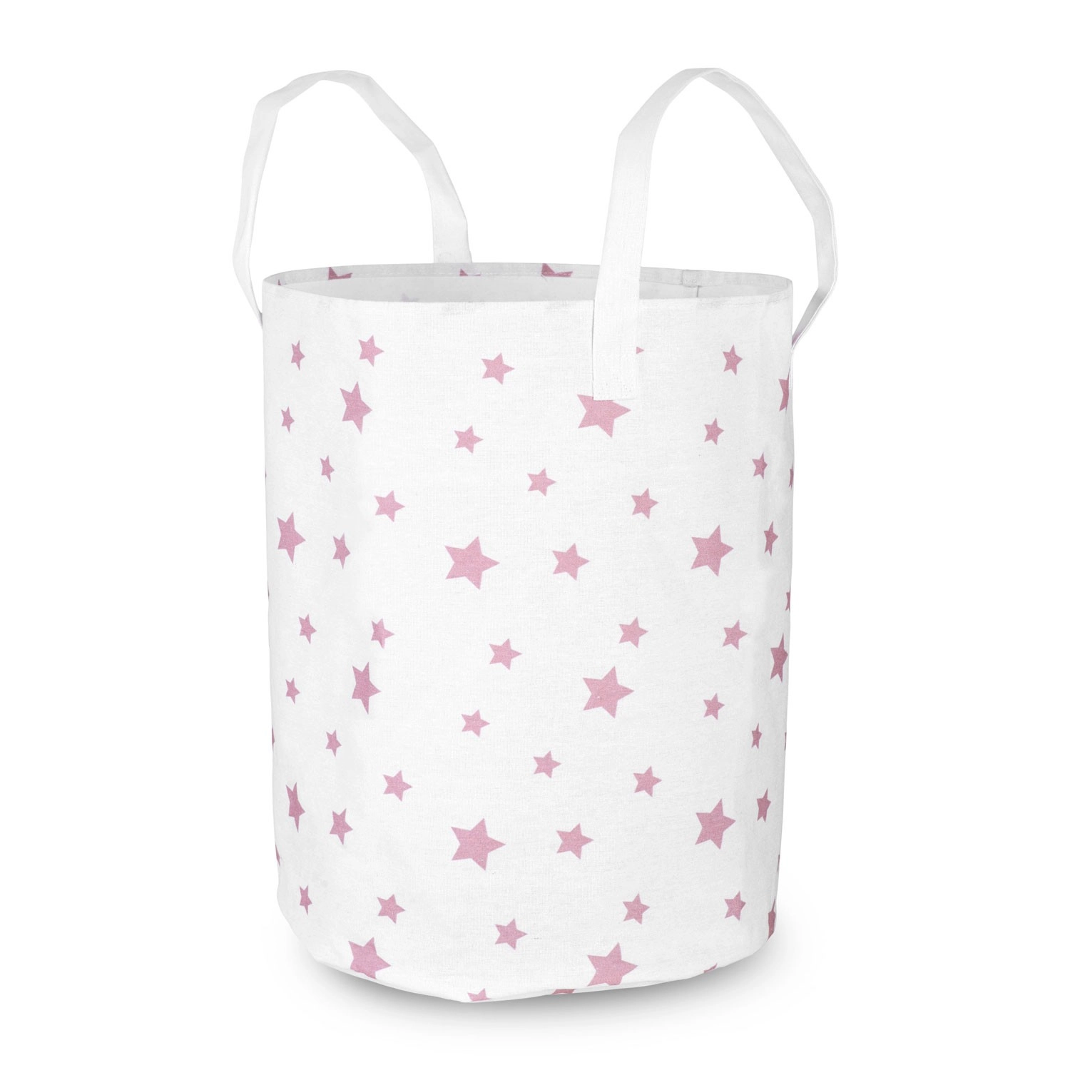 Grand panier textile pour jouets Nukido, léger, en blanc avec de petites étoiles roses, aide à maintenir l’ordre dans la chambre d’enfant. Grâce à sa grande capacité, à ses poignées solidement cousues et à son entretien facile, il est idéal pour les jouets, le linge et les petits objets. Le coton est agréable et résistant, et le panier est pliable et portable pour une utilisation quotidienne.