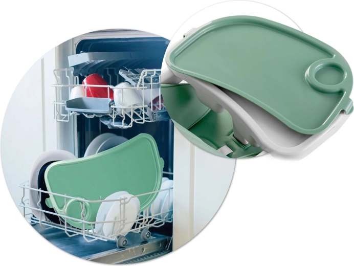 Le plateau à bords relevés avec son insert séparé retient miettes et boissons renversées. Il se retire et se rince sous l’eau ou se lave au lave-vaisselle.