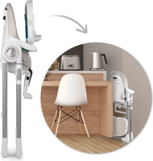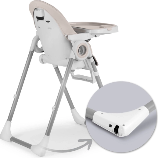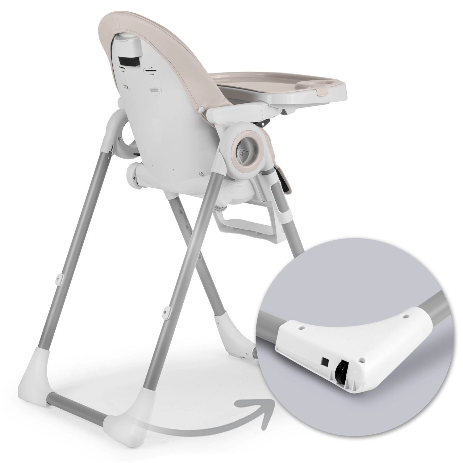 Le plateau avec insert et bords surélevés retient les saletés et peut être lavé sous l’eau courante ou au lave-vaisselle. Une fois pliée, la chaise prend un minimum de place.