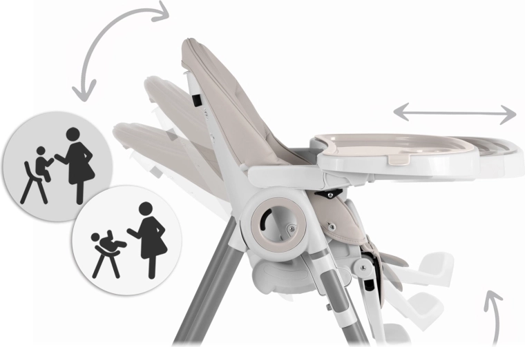 Réglage de la hauteur sur 8 niveaux, 5 positions d’inclinaison du dossier et repose-pieds ajustable permettent d’utiliser la chaise dès les premiers mois comme transat jusqu’aux repas en toute autonomie.