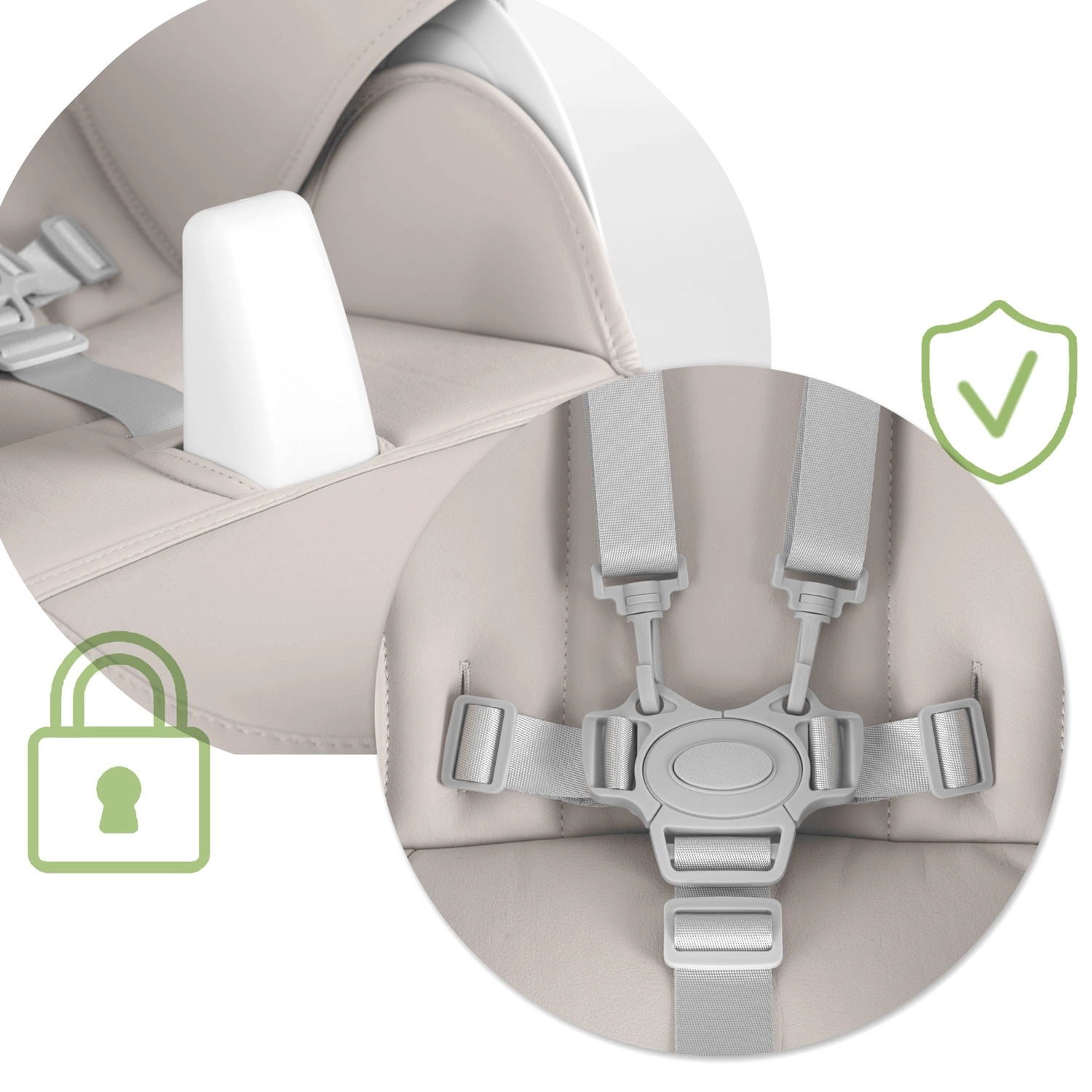 Un rembourrage confortable, un harnais de sécurité 5 points et une butée centrale empêchent l’enfant de glisser. La base large assure la stabilité pendant les repas et les jeux.