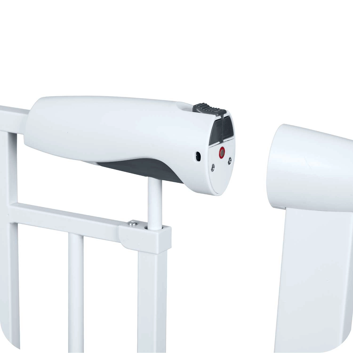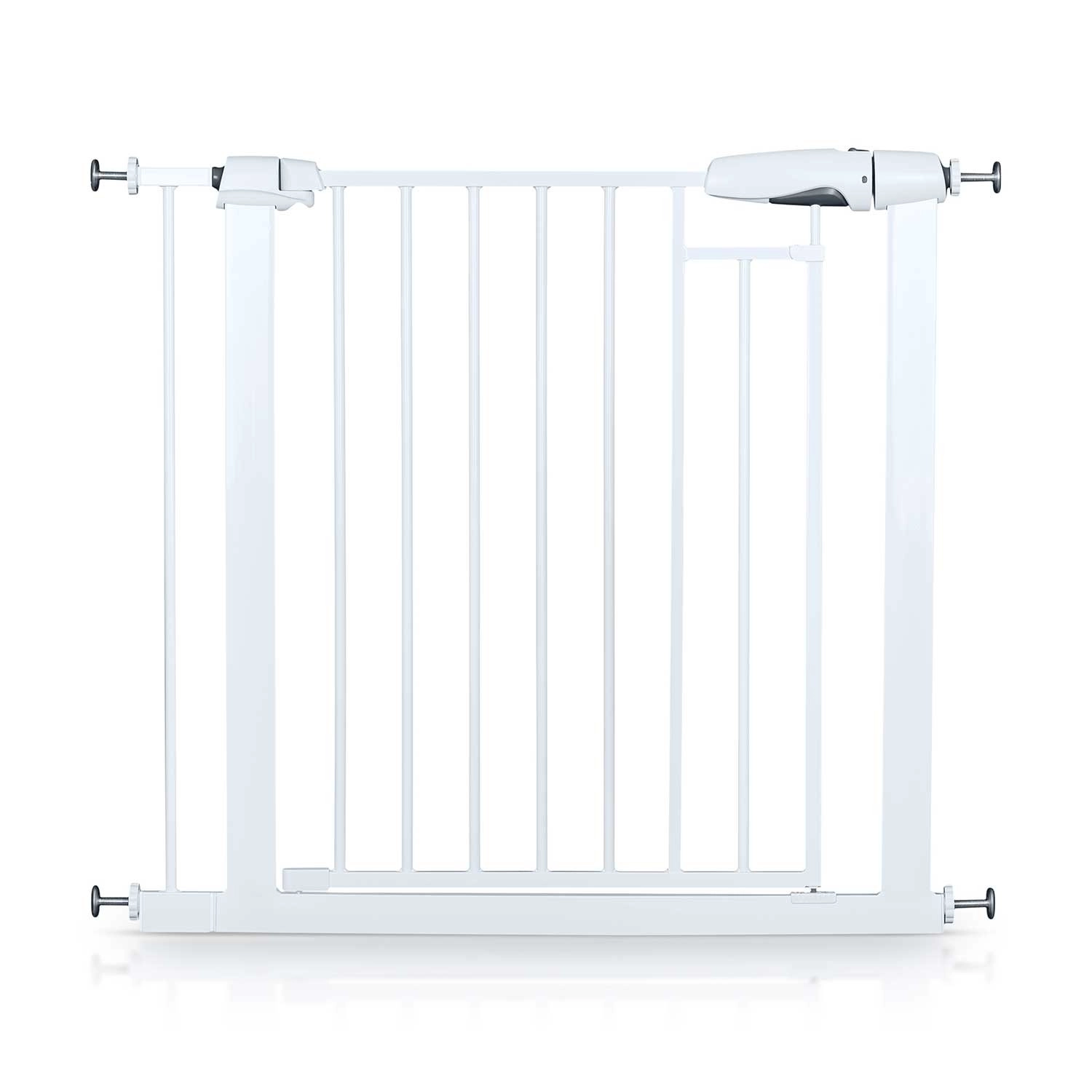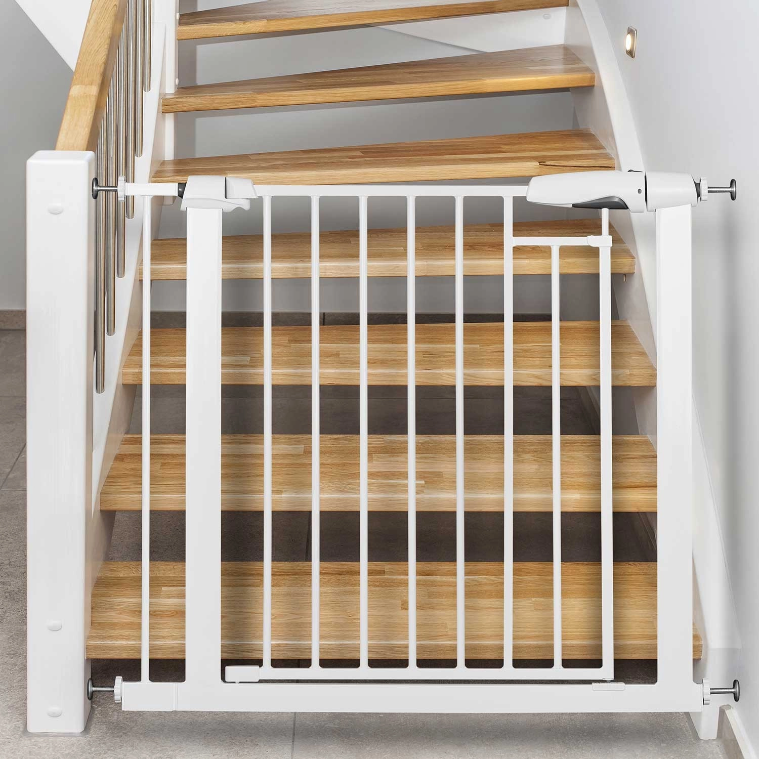 La barrière de sécurité NUKIDO protège les enfants et les animaux domestiques de l’accès aux escaliers ou aux zones dangereuses. Elle se monte sans perçage grâce à un système de pression, possède une structure métallique blanche et une fermeture magnétique avec ouverture à une main. Grâce à sa largeur réglable de 76 à 104 cm, elle s’adapte parfaitement aux portes et aux passages.