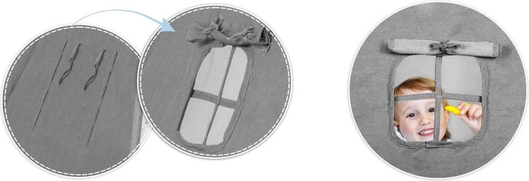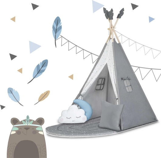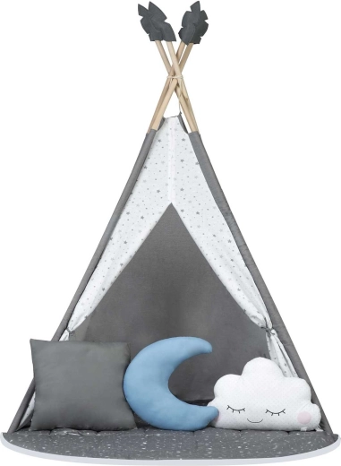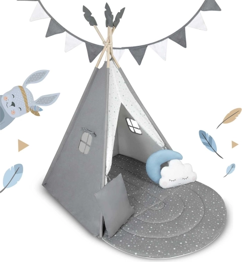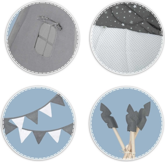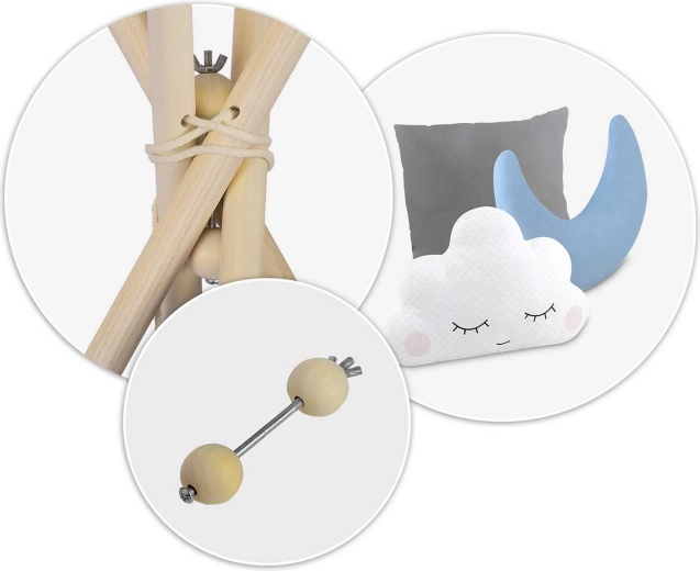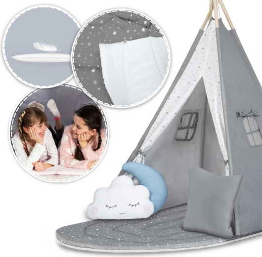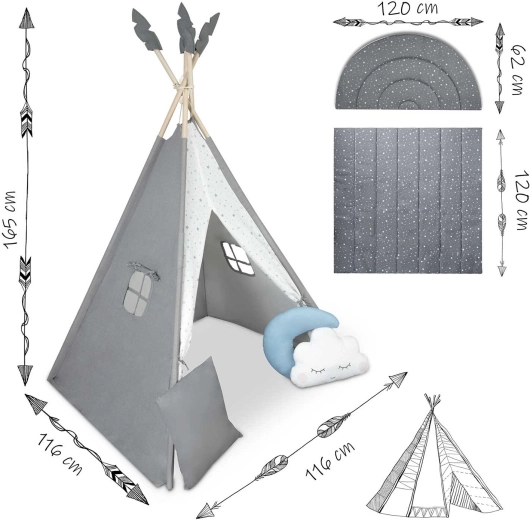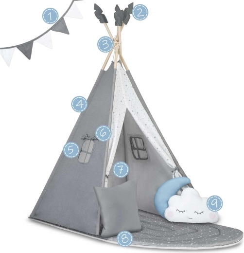 Il comprend un tapis en deux parties extra épais avec plots antidérapants pour la sécurité et la chaleur depuis le sol – il peut être utilisé séparément comme petit tapis. Le pack inclut également 3 coussins (carré, lune, nuage), une guirlande, des plumes en feutre et un stabilisateur pour une stabilité maximale de la structure composée de 4 perches en épicéa/pin. Deux fenêtres avec stores et des liens pour fixer la porte ouvrent la voie à l’imagination et à l’aération.
