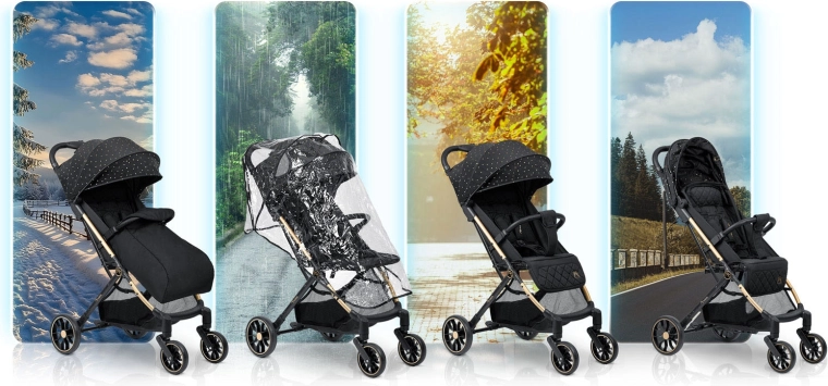 • Confort par tous les temps : capote anti-UV et pluie, habillage pluie et couvre-jambes inclus.