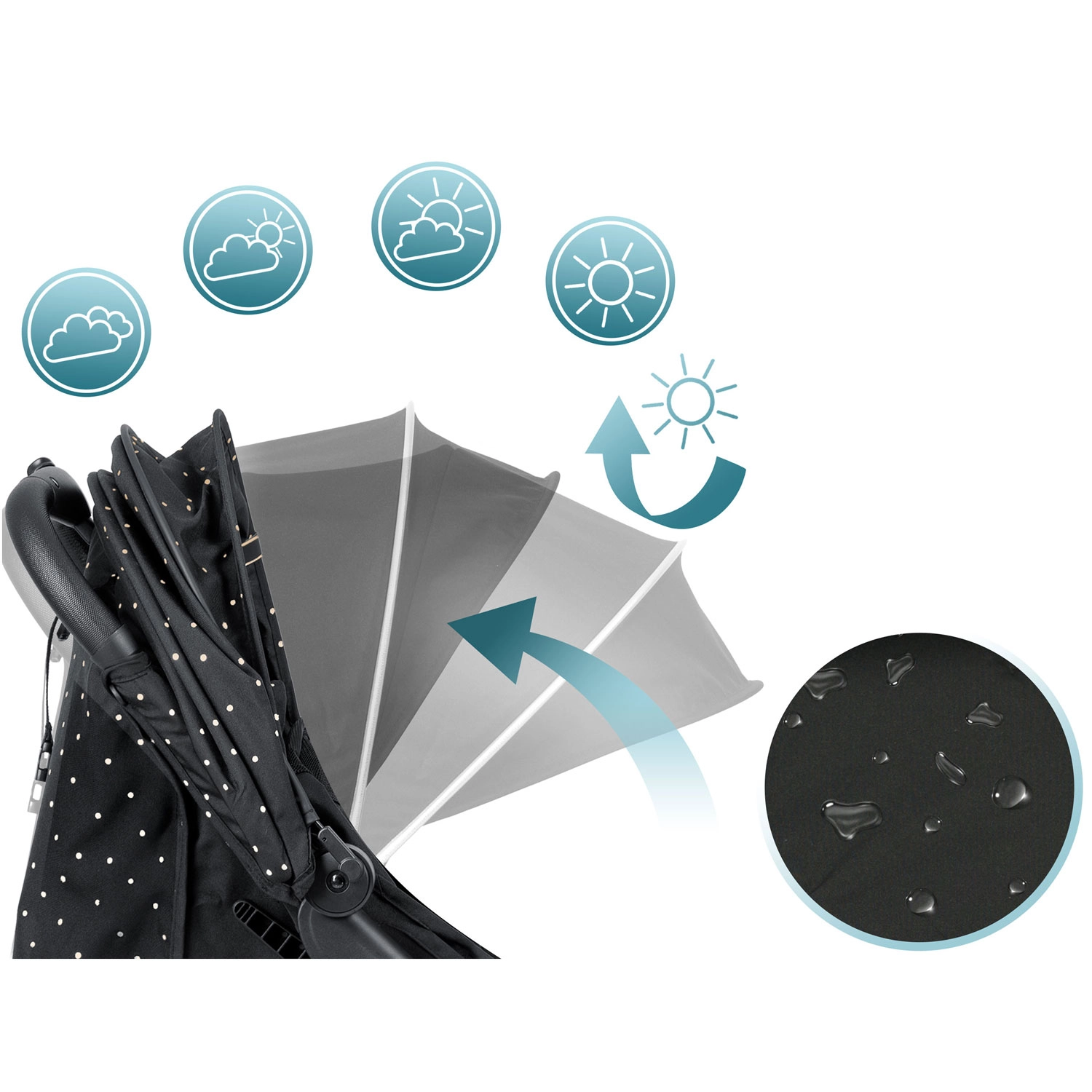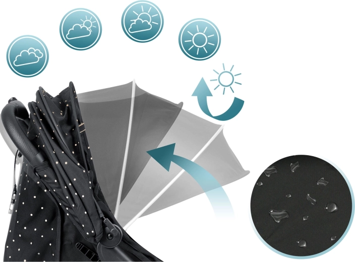 La capote multi-positions protège l’enfant du soleil, du vent et des petites pluies. Le traitement déperlant du tissu facilite l’entretien et assure le confort en toute saison.