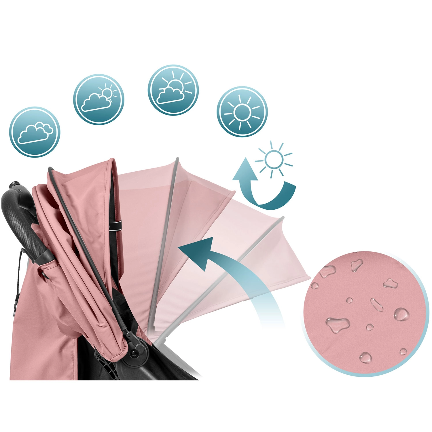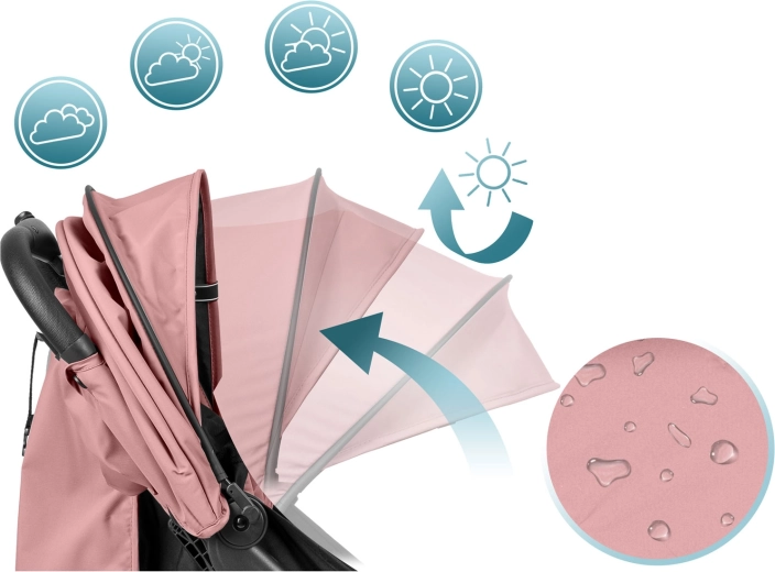 La capote extensible avec protection UV et traitement déperlant protège du soleil, du vent et des petites averses. L’habillage pluie est inclus.