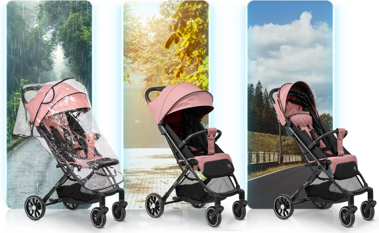 - Par tous les temps : capote adaptable au soleil et à la pluie, habillage pluie inclus.