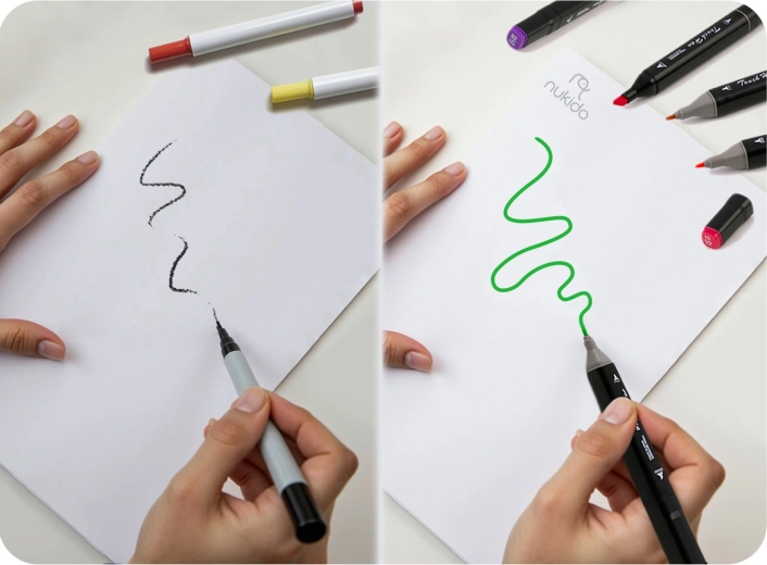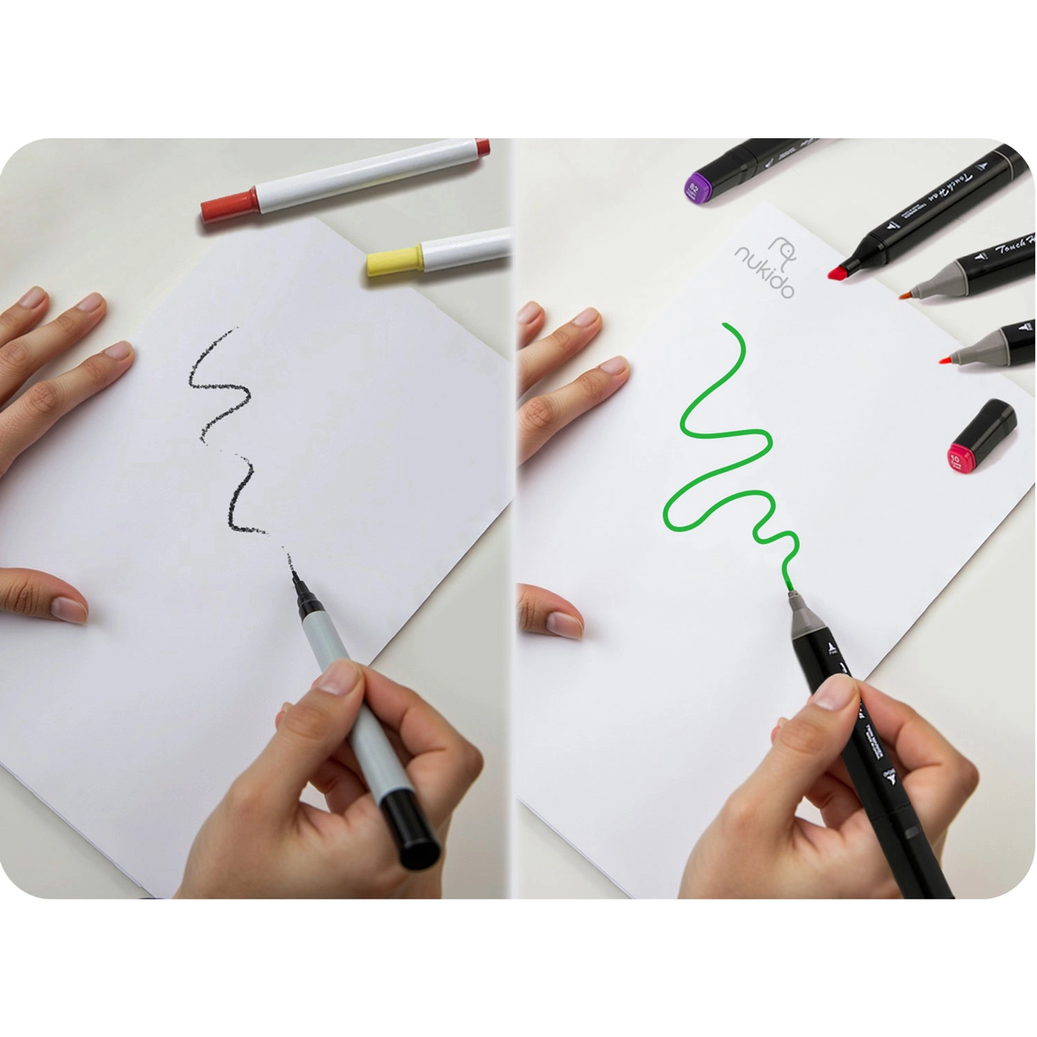Le coffret de 80 marqueurs NUKIDO est conçu pour les artistes, étudiants et créatifs amateurs souhaitant obtenir un rendu professionnel. Deux pointes dans un seul corps – fine env. 2 mm pour les traits détaillés et biseautée env. 7 mm pour un remplissage rapide – offrent un contrôle total sur chaque geste. L’encre alcool sèche rapidement, ne bave pas une fois sèche et crée des dégradés lisses sans traces.