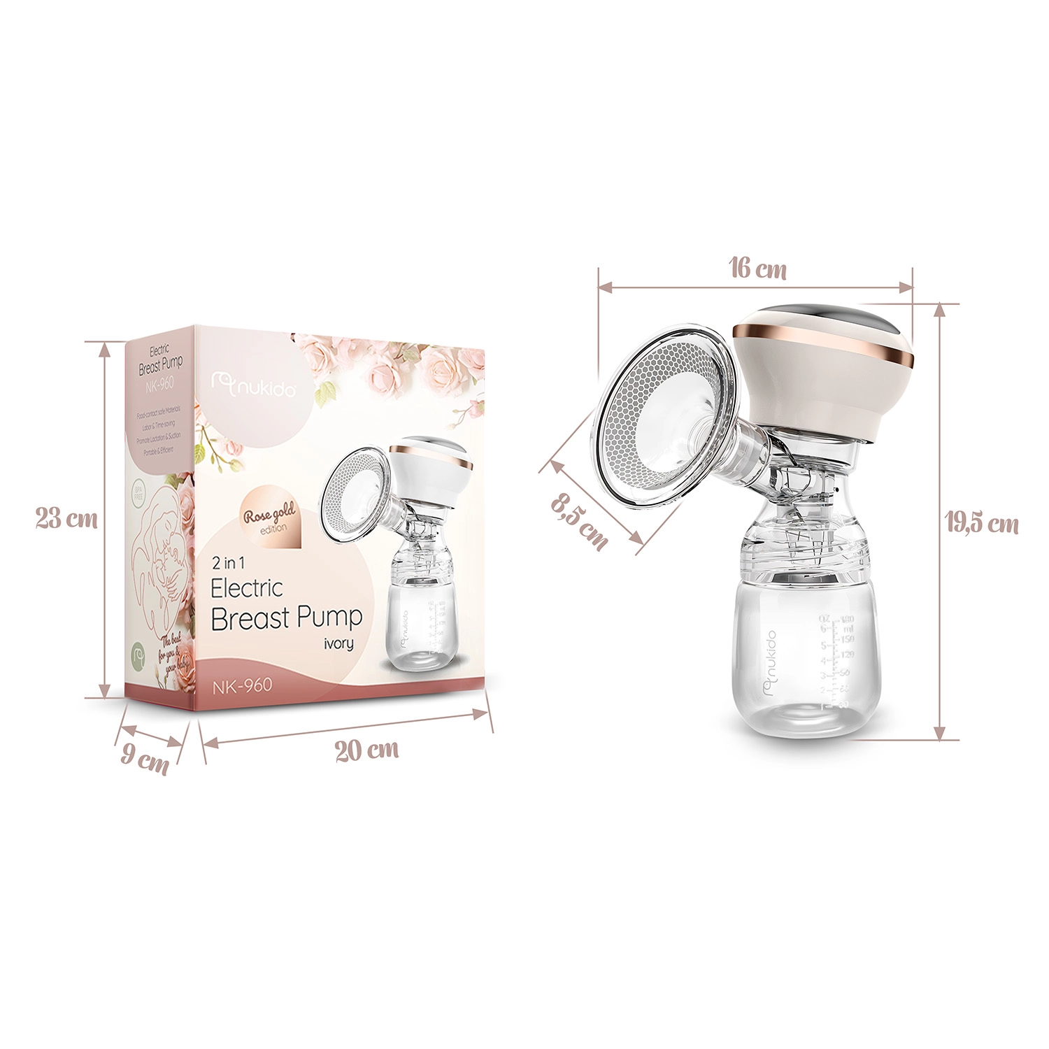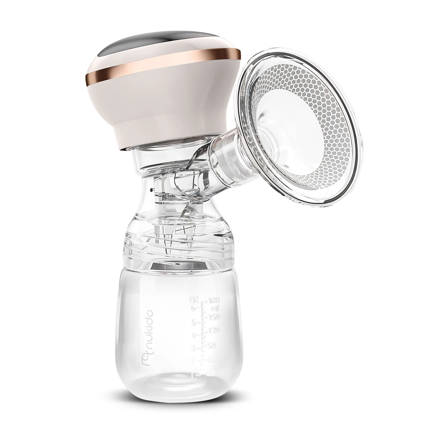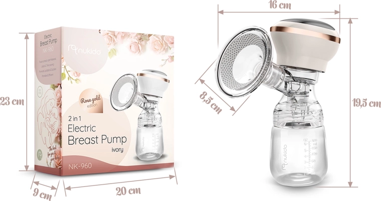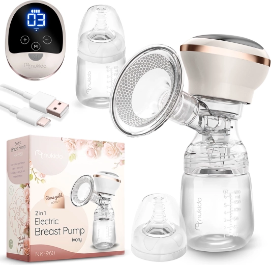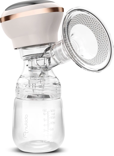 Le tire-lait électrique Nukido, compact et silencieux, offre 3 phases d’aspiration, jusqu’à 9 niveaux de stimulation, un écran LED à commande tactile et un usage sans fil grâce à une batterie lithium intégrée. Inclus : biberon 180 ml avec tétine dynamique, coussin de massage en silicone souple pour plus de confort et charge via USB‑C. Les matériaux sont sans BPA et les pièces (sauf le panneau électrique) passent au lave‑vaisselle.