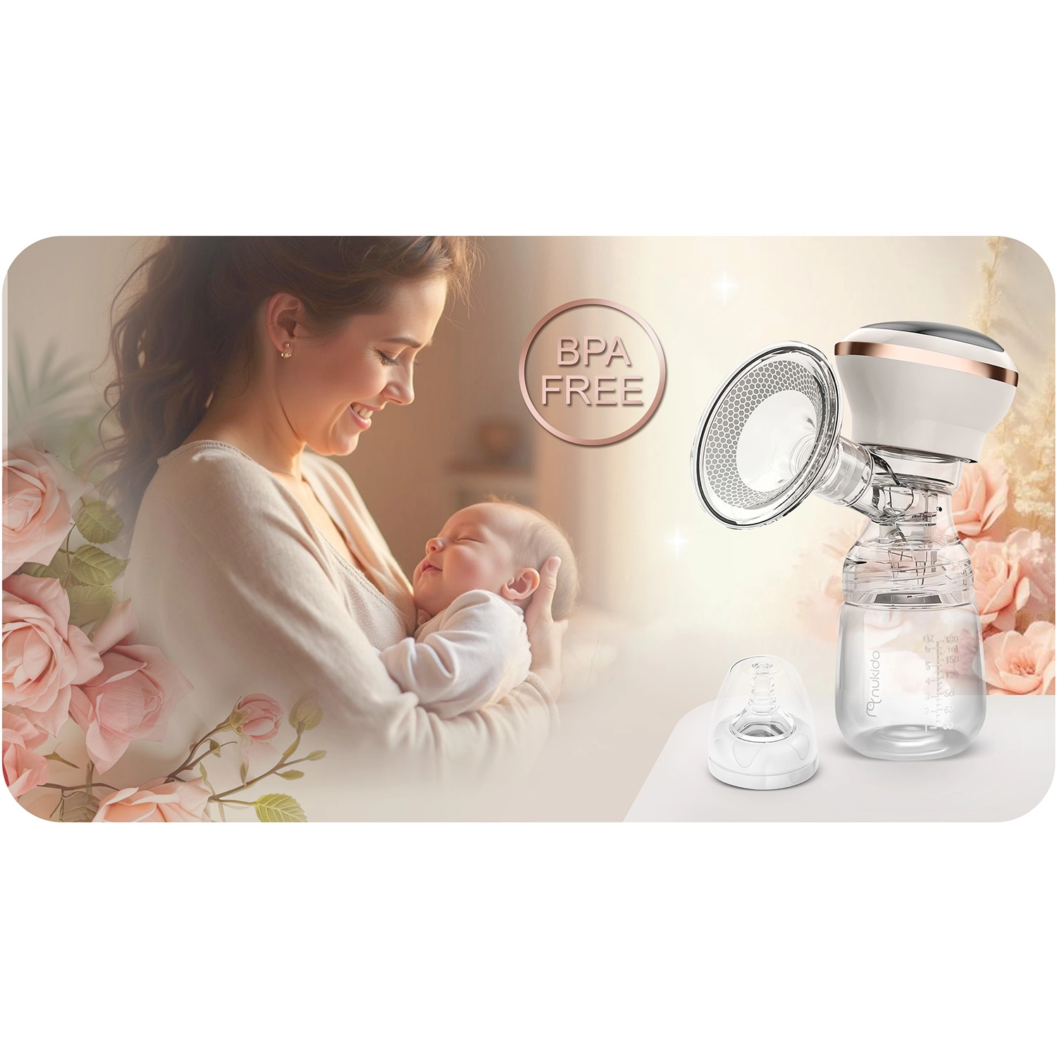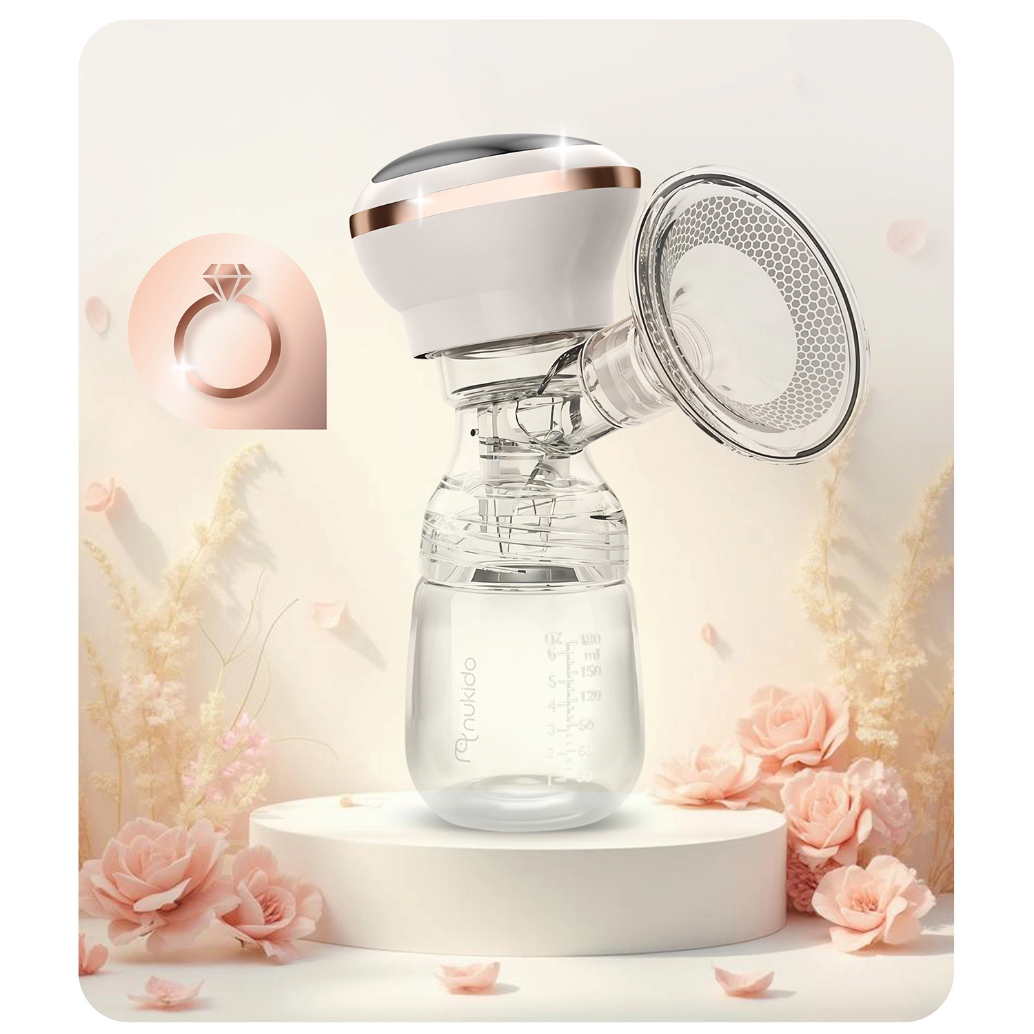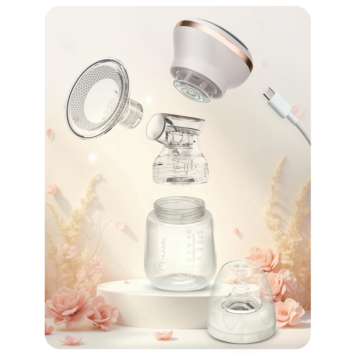 Le tire-lait électrique Nukido, compact et silencieux, offre 3 phases d’aspiration, jusqu’à 9 niveaux de stimulation, un écran LED à commande tactile et un usage sans fil grâce à une batterie lithium intégrée. Inclus : biberon 180 ml avec tétine dynamique, coussin de massage en silicone souple pour plus de confort et charge via USB‑C. Les matériaux sont sans BPA et les pièces (sauf le panneau électrique) passent au lave‑vaisselle.