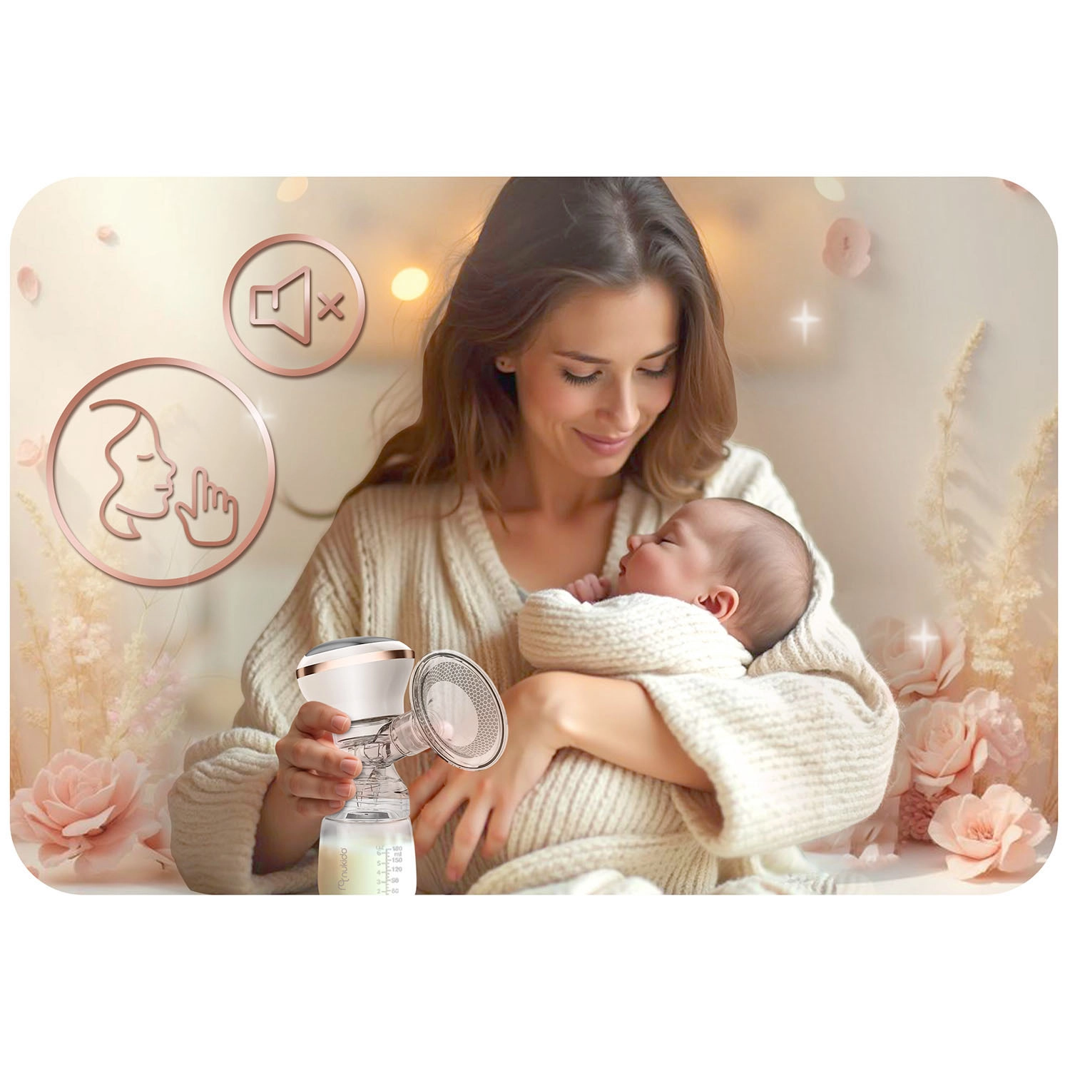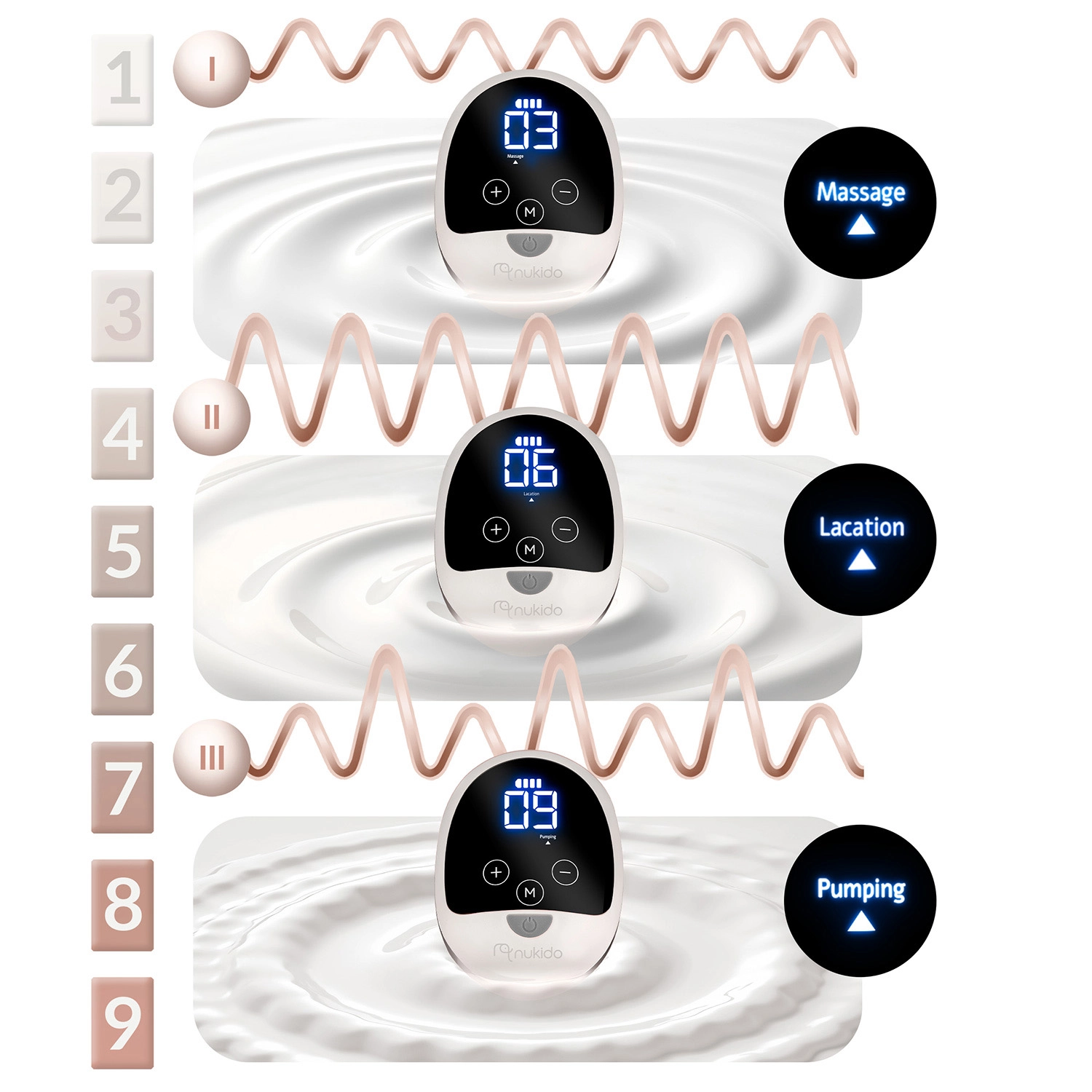 Le tire-lait Nukido reproduit fidèlement le rythme naturel de succion du bébé pour un recueil de lait efficace et tout en douceur. Trois modes (stimulation, aspiration, extraction profonde) et 9 niveaux réglables vous permettent d’adapter la puissance à vos besoins sans douleur. Le coussin de massage en silicone au toucher délicat stimule le réflexe d’éjection et augmente le confort, même lors d’utilisations prolongées.