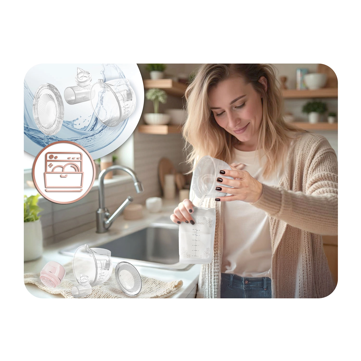 Le coussin massant en silicone souple, de forme anatomique, s’adapte délicatement et favorise l’éjection du lait par un massage doux. La conception sans fil avec batterie lithium intégrée assure une liberté de mouvement jusqu’à 3 heures, et la recharge se fait aisément via USB‑C. Les pièces (hors panneau électrique) passent au lave-vaisselle, les matériaux ont des propriétés antibactériennes et sont sans BPA.