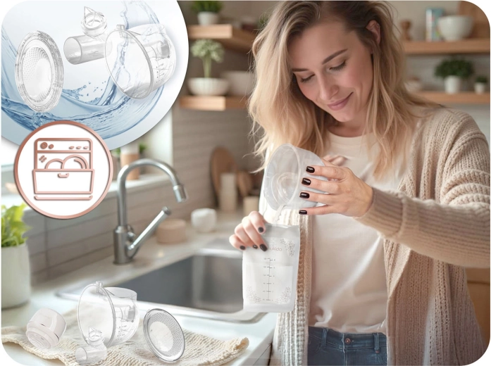 Véritable liberté de mouvement – le tire‑lait est sans fil et offre jusqu’à environ 3 heures d’utilisation par charge via USB‑C. Sa forme compacte permet une utilisation discrète à la maison, au travail et en voyage. Un clip de réglage de bretelle de soutien‑gorge est inclus pour un tirage mains libres confortable. Toutes les pièces non électriques peuvent être lavées au lave‑vaisselle (sauf le panneau électronique) et les matériaux sont sans BPA et dotés de propriétés antibactériennes.