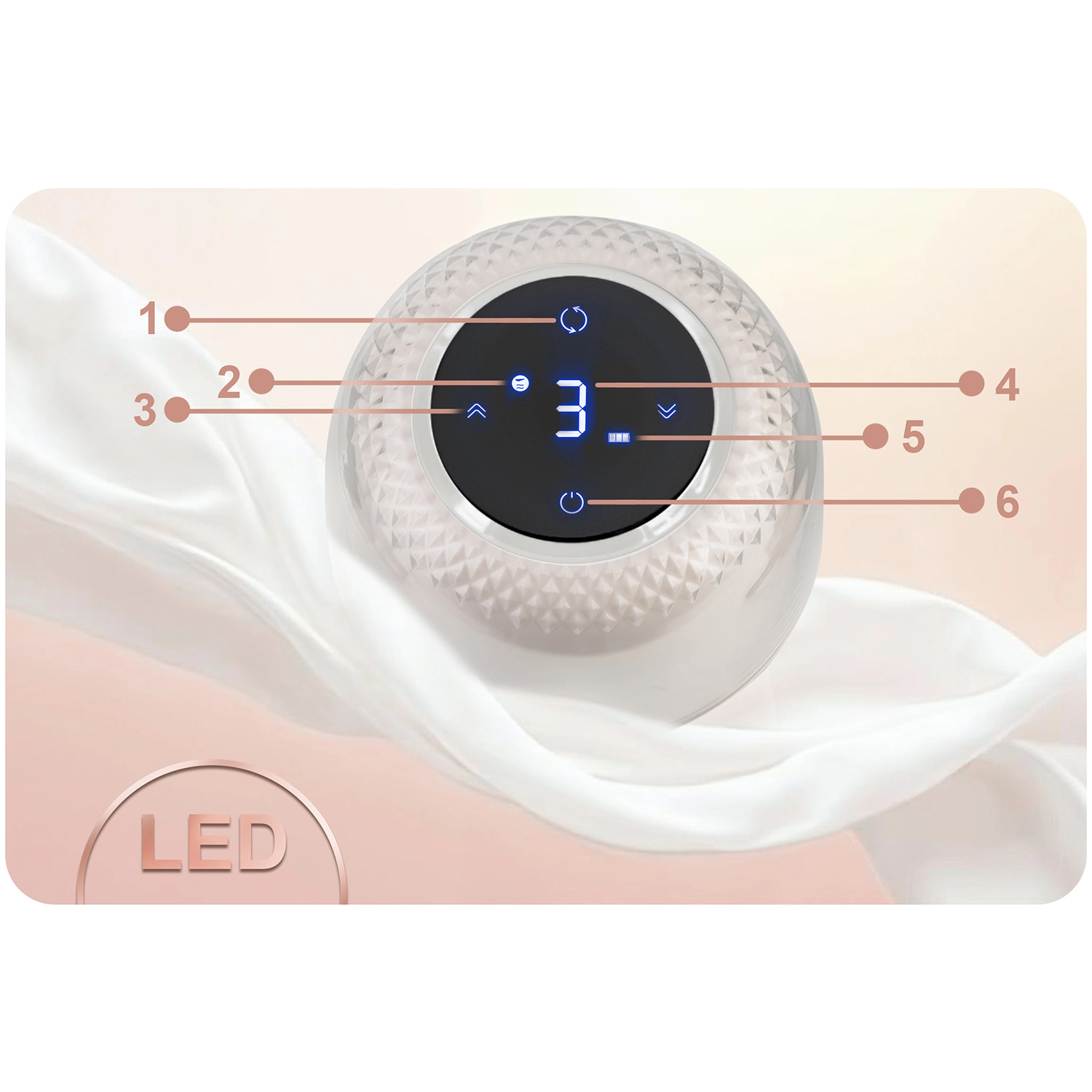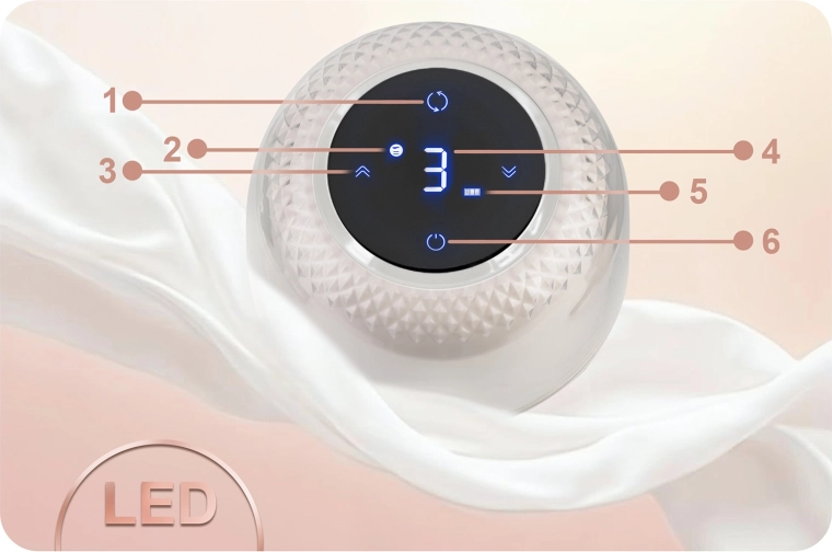 - Accessoire de massage avec couvercle anti‑poussière, corps avec moteur et écran LED, membrane en silicone, câble avec adaptateur, clip de réglage de bretelle de soutien‑gorge, récipient 210 ml
