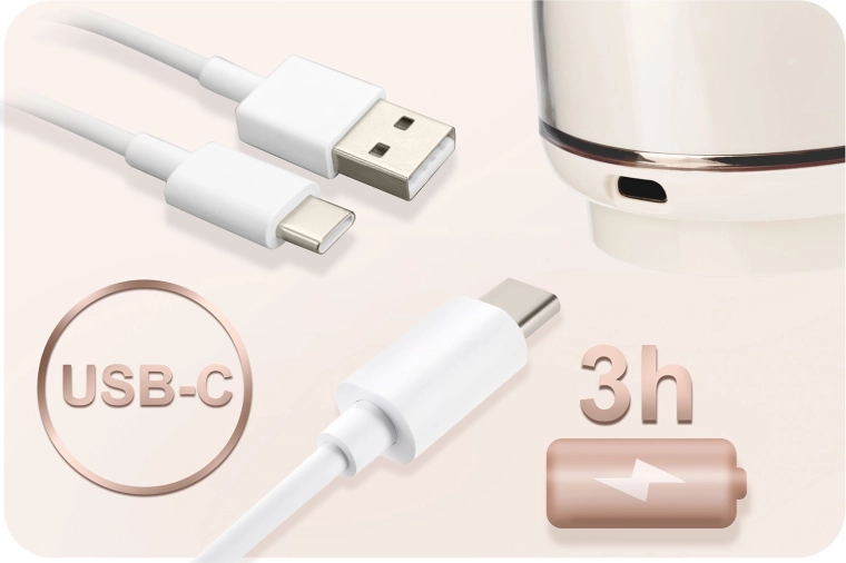 La batterie lithium intégrée offre jusqu’à 3 heures de fonctionnement. La recharge via USB‑C est rapide et pratique, pour extraire à la maison, au travail ou en voyage.