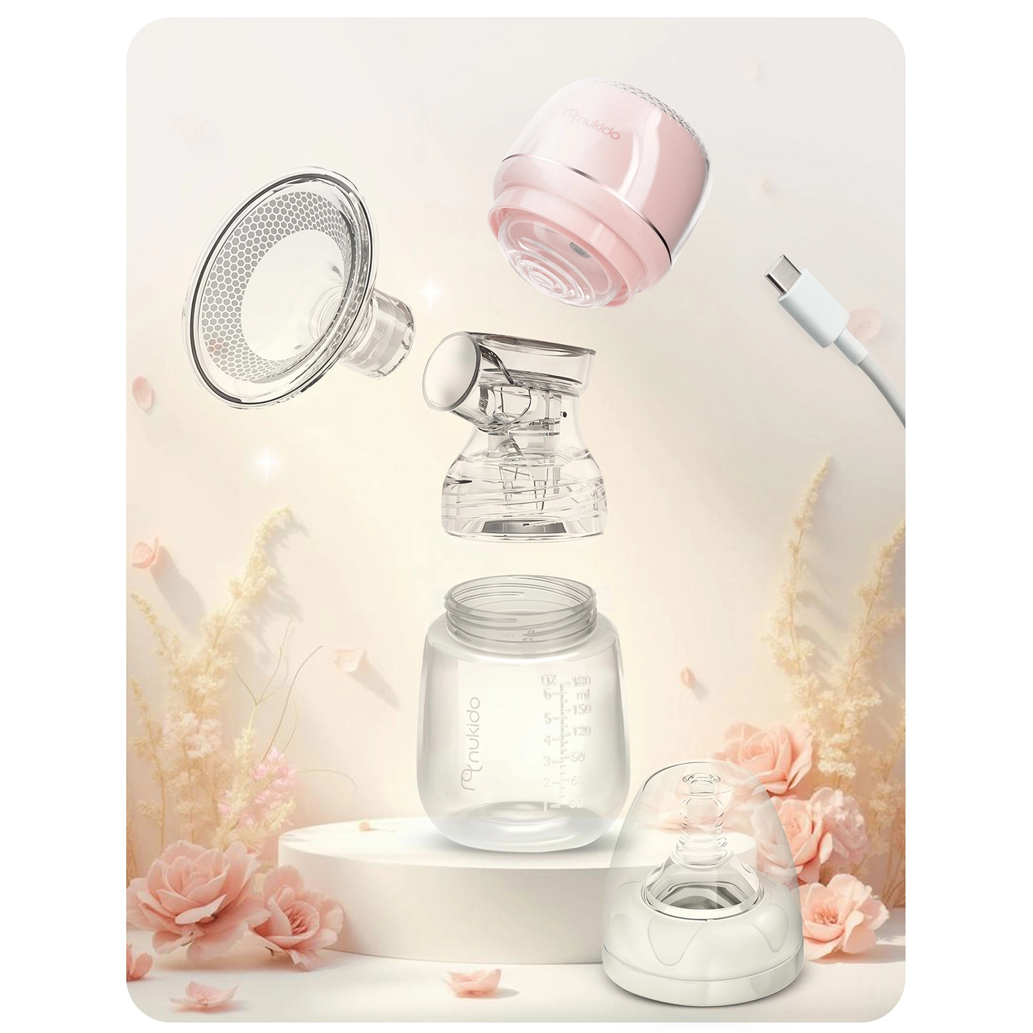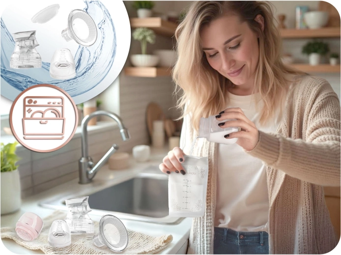 Le coussin de massage ergonomique en silicone est doux pour la peau et favorise l’écoulement du lait par un massage délicat. L’écran LED à commandes tactiles permet de sélectionner rapidement les modes et l’intensité et d’afficher l’état de la batterie. La batterie lithium intégrée assure jusqu’à 3 heures d’utilisation et se recharge facilement via USB‑C. Le biberon de 180 ml est fourni avec une tétine dynamique qui soutient une bonne technique de succion et ne perturbe pas l’allaitement.