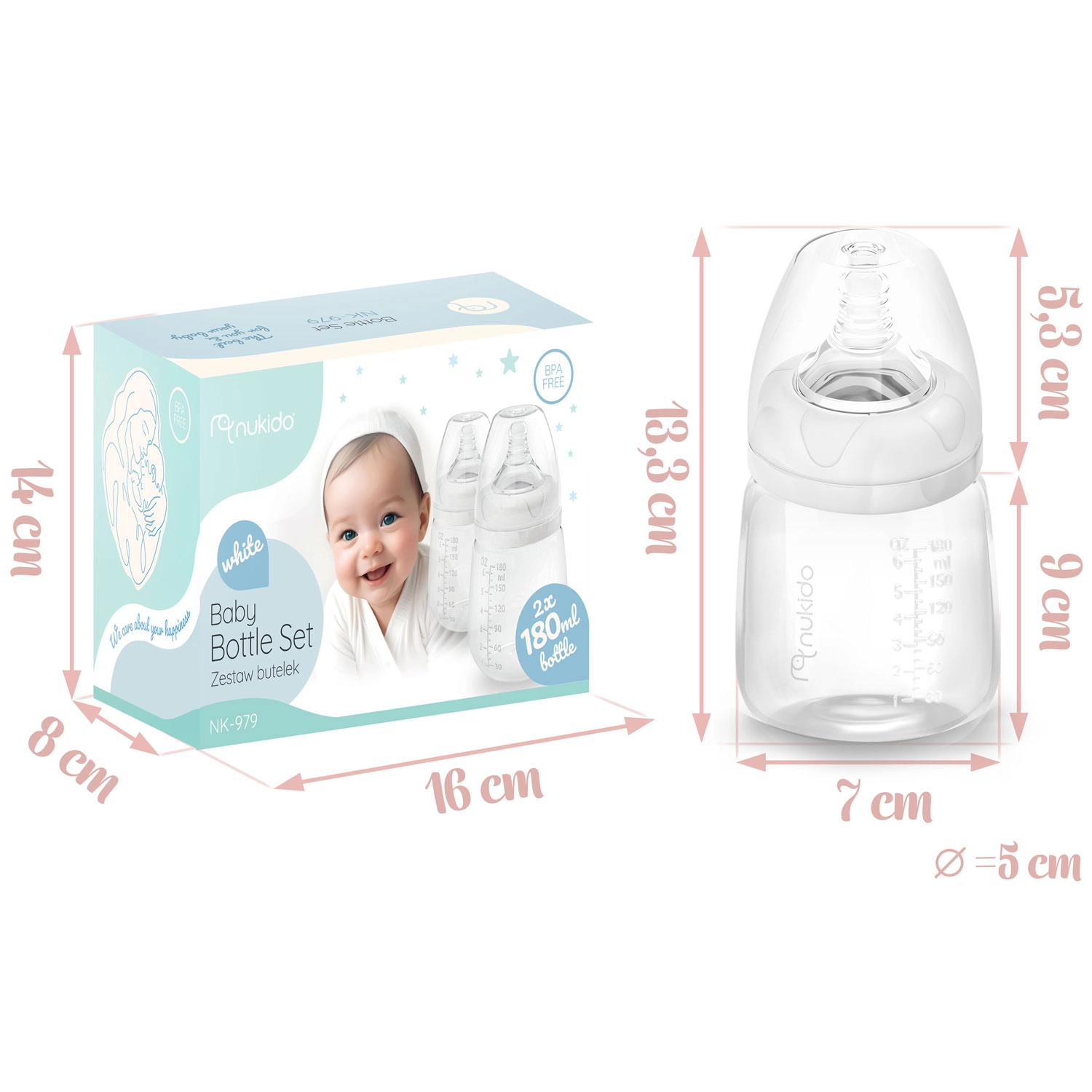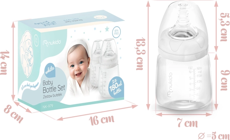 Pratique set de deux biberons de 180 ml en polypropylène sûr pour l’alimentation quotidienne. Les biberons sont légers, faciles à tenir et disposent de repères de mesure lisibles, d’un large goulot pour un nettoyage facile et d’une tétine dynamique en silicone imitant le mouvement du mamelon maternel. Ils sont sans BPA, compatibles avec les tire-laits NUKIDO et peuvent être lavés au lave-vaisselle ou à la main.
