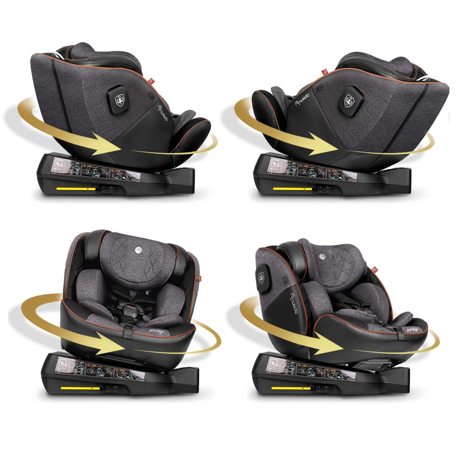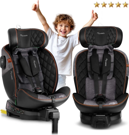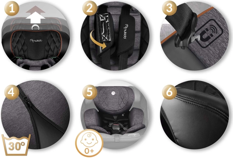Le siège auto Nukido Prestige Line est conçu selon la norme ECE R129 i-Size pour une taille de 40 à 150 cm et accompagne l’enfant de la naissance jusqu’à environ 12 ans. Grâce à la base pivotante à 360°, vous attachez facilement l’enfant de côté vers la porte, puis verrouillez le siège dans la position souhaitée. La SIP – Side Impact Protection avec flancs renforcés protège la tête, le cou et la colonne vertébrale en cas de choc latéral, tandis que l’ISOFIX et la jambe de stabilisation garantissent une fixation solide et rapide.