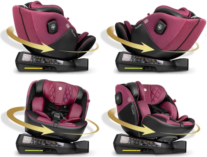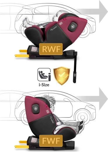 Tournez simplement le siège vers la porte, attachez l’enfant sans vous tordre le dos et d’un seul geste choisissez RWF ou FWF. La possibilité de verrouillage sur 4 positions accroît le confort et la sécurité.