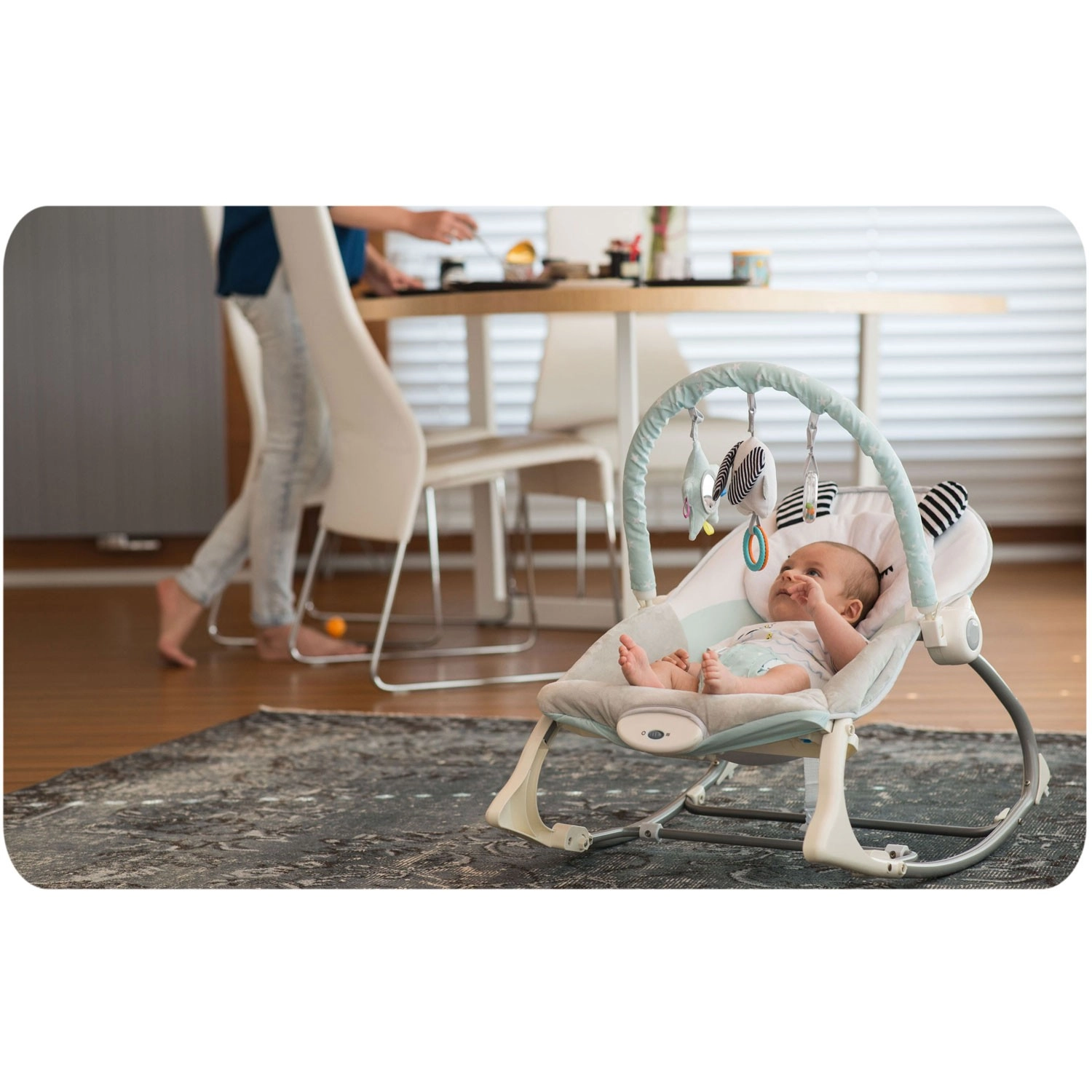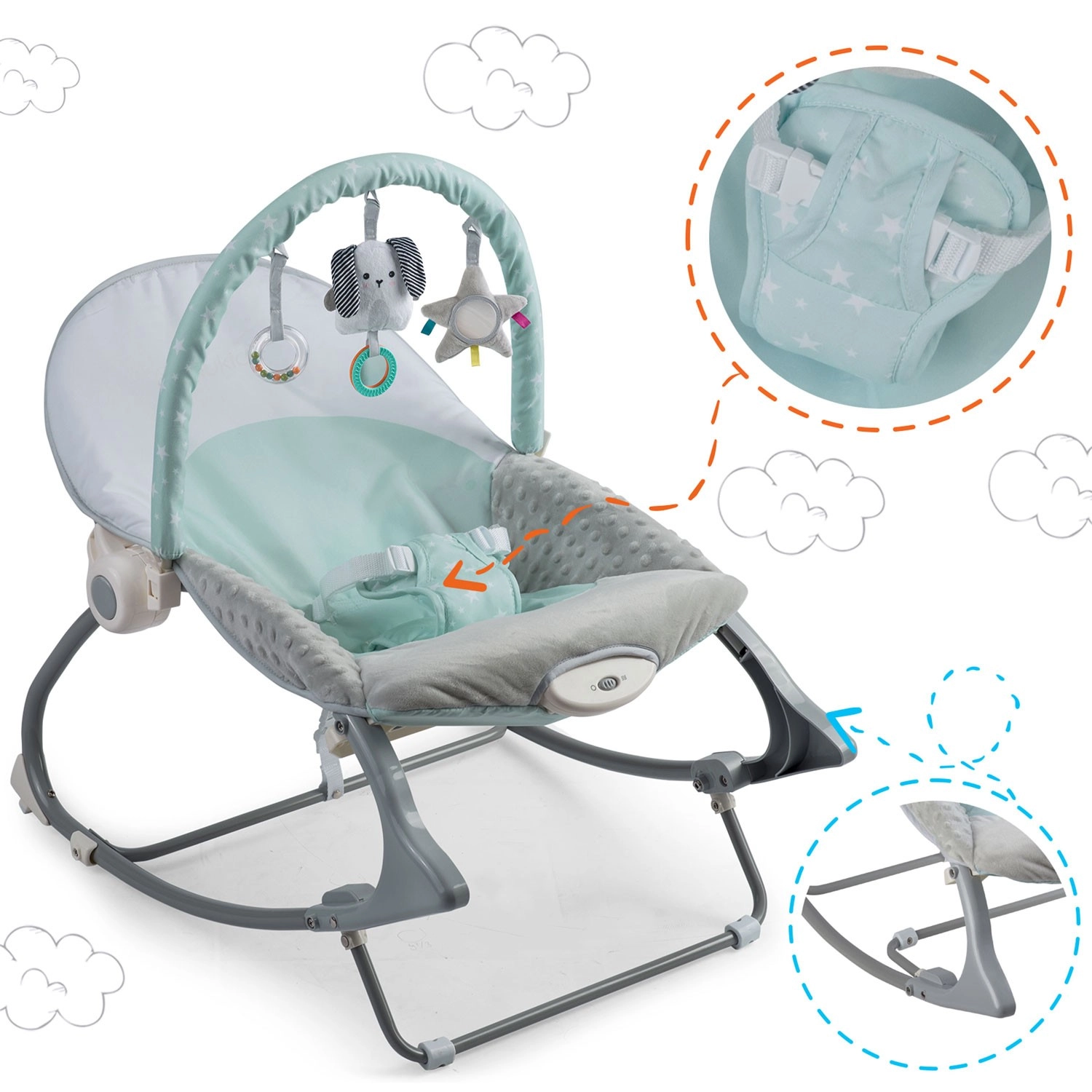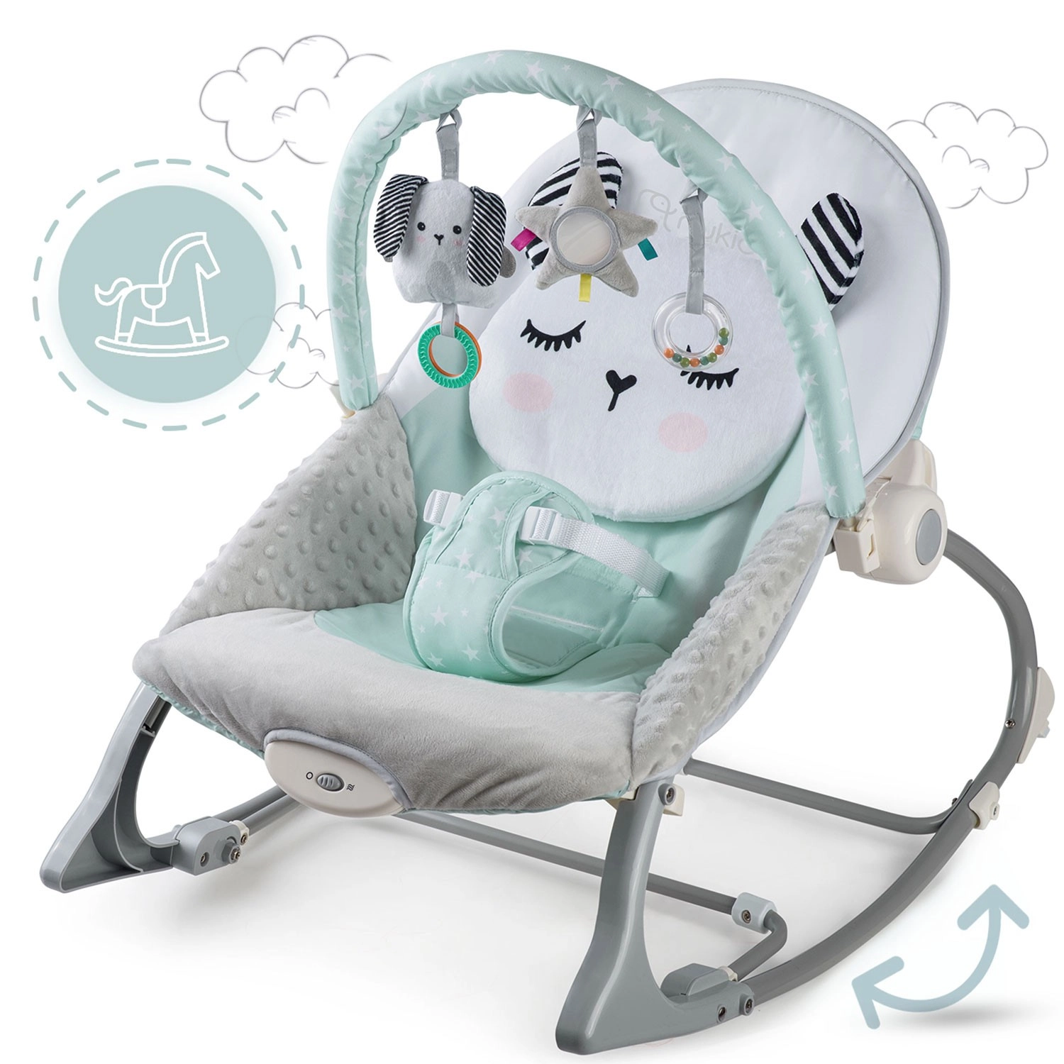 L’arche amovible avec jouets en peluche bruissants favorise le développement de la vue et du toucher. Les housses douces et agréables au toucher assurent le confort, se retirent facilement et se lavent à la main. La structure stable avec cadre métallique et option de verrouillage du balancement élargit les usages du transat selon les besoins du moment.