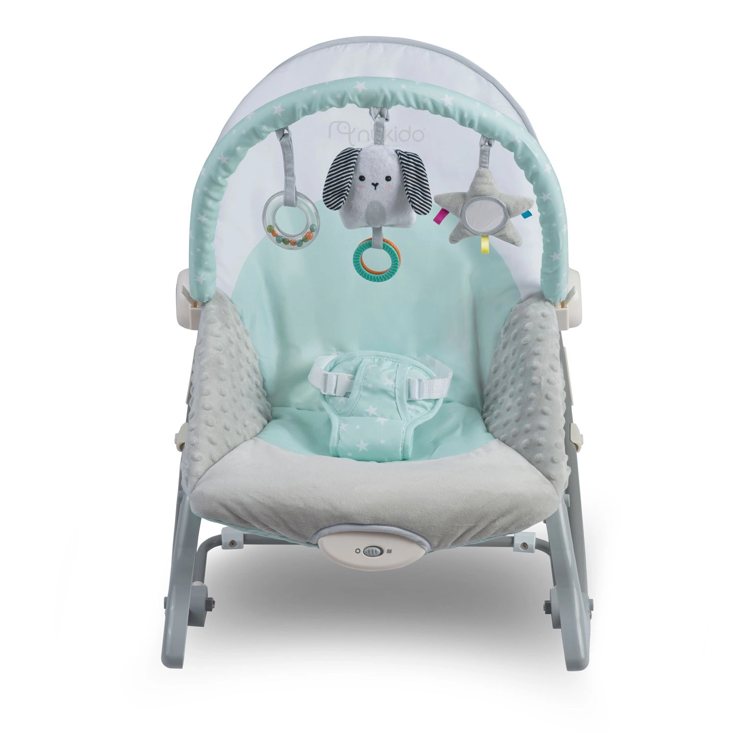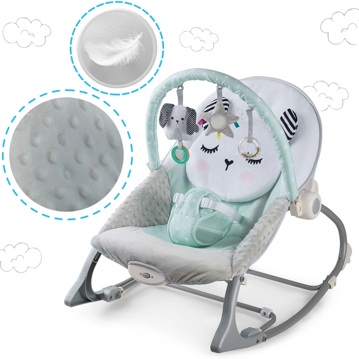 Le transat multifonction pour bébé NUKIDO en coloris menthe apporte du calme à votre tout-petit et libère les mains des parents. Il offre des vibrations apaisantes, un balancement doux avec option de verrouillage, une arche amovible avec jouets pour la stimulation sensorielle et un rembourrage doux et confortable. La sécurité est assurée par un harnais 3 points et des pieds antidérapants.