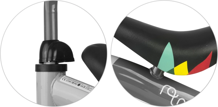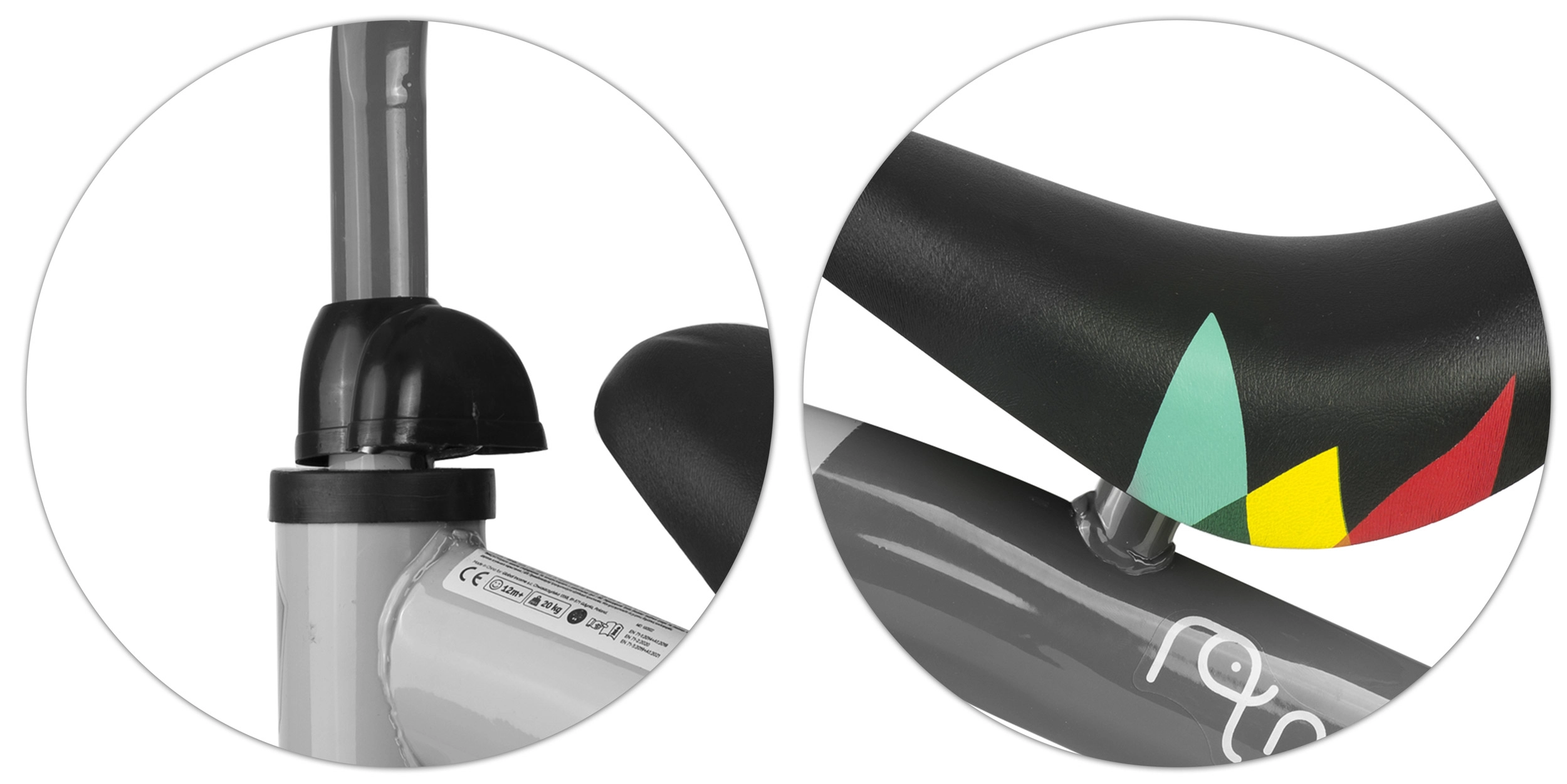 La selle en mousse absorbe les irrégularités et les poignées caoutchoutées avec butées assurent une prise en main sûre pour les petites mains.