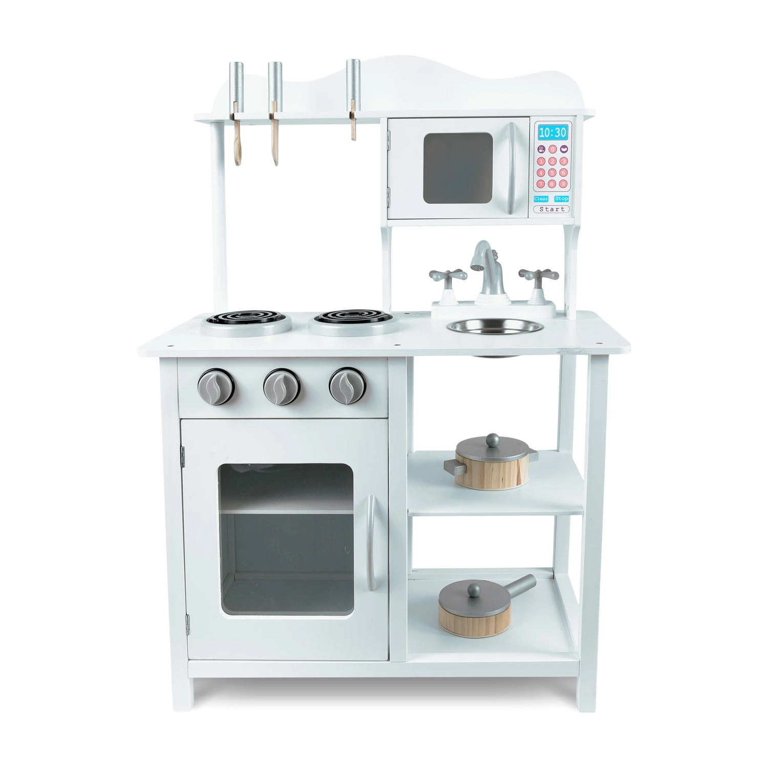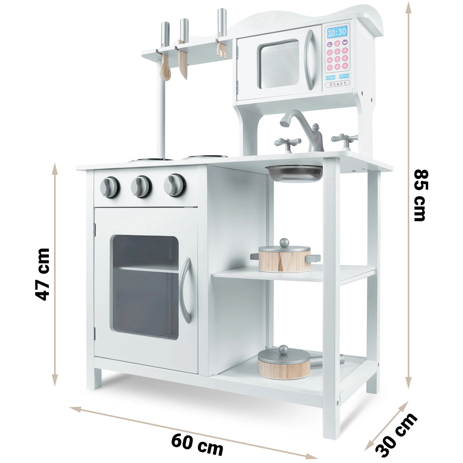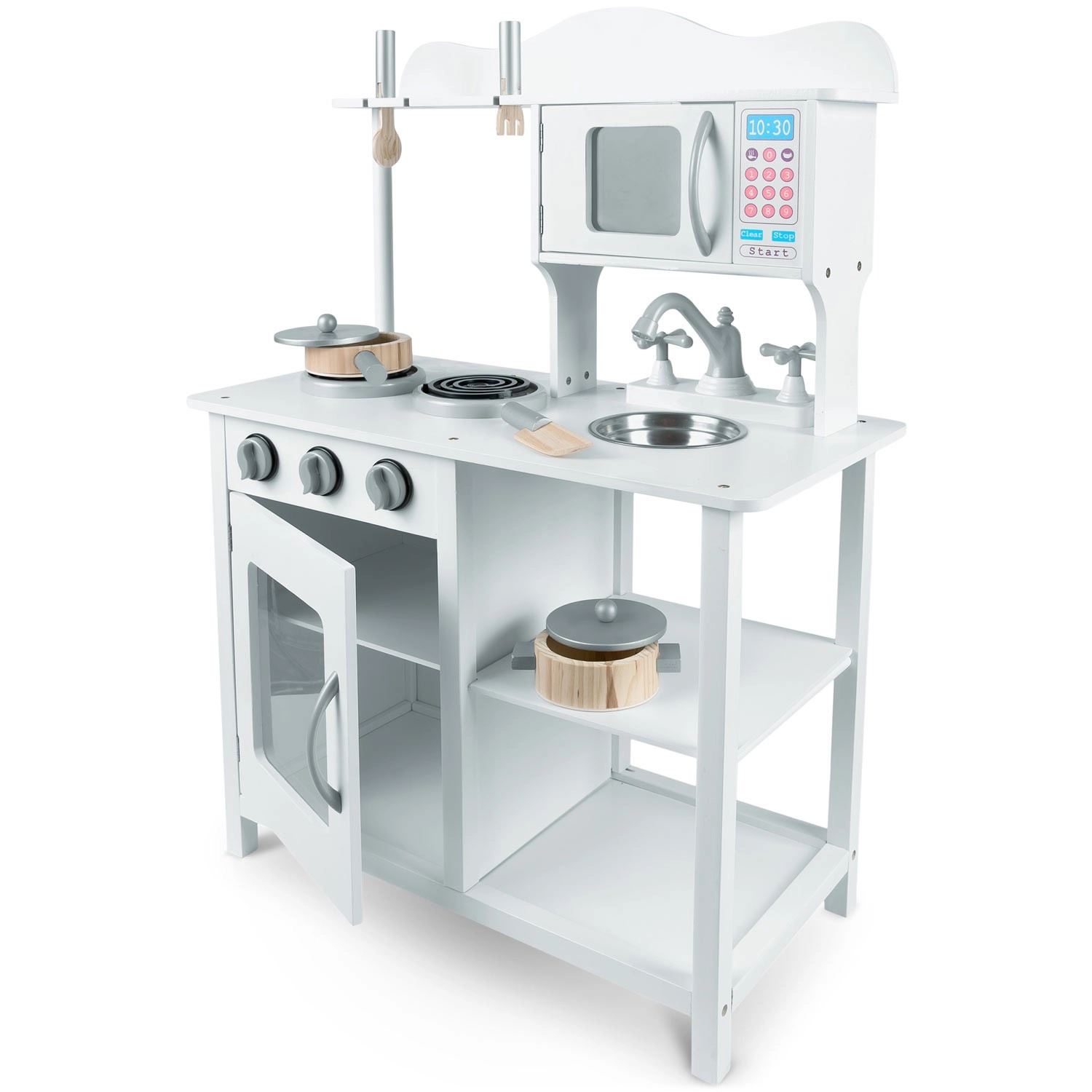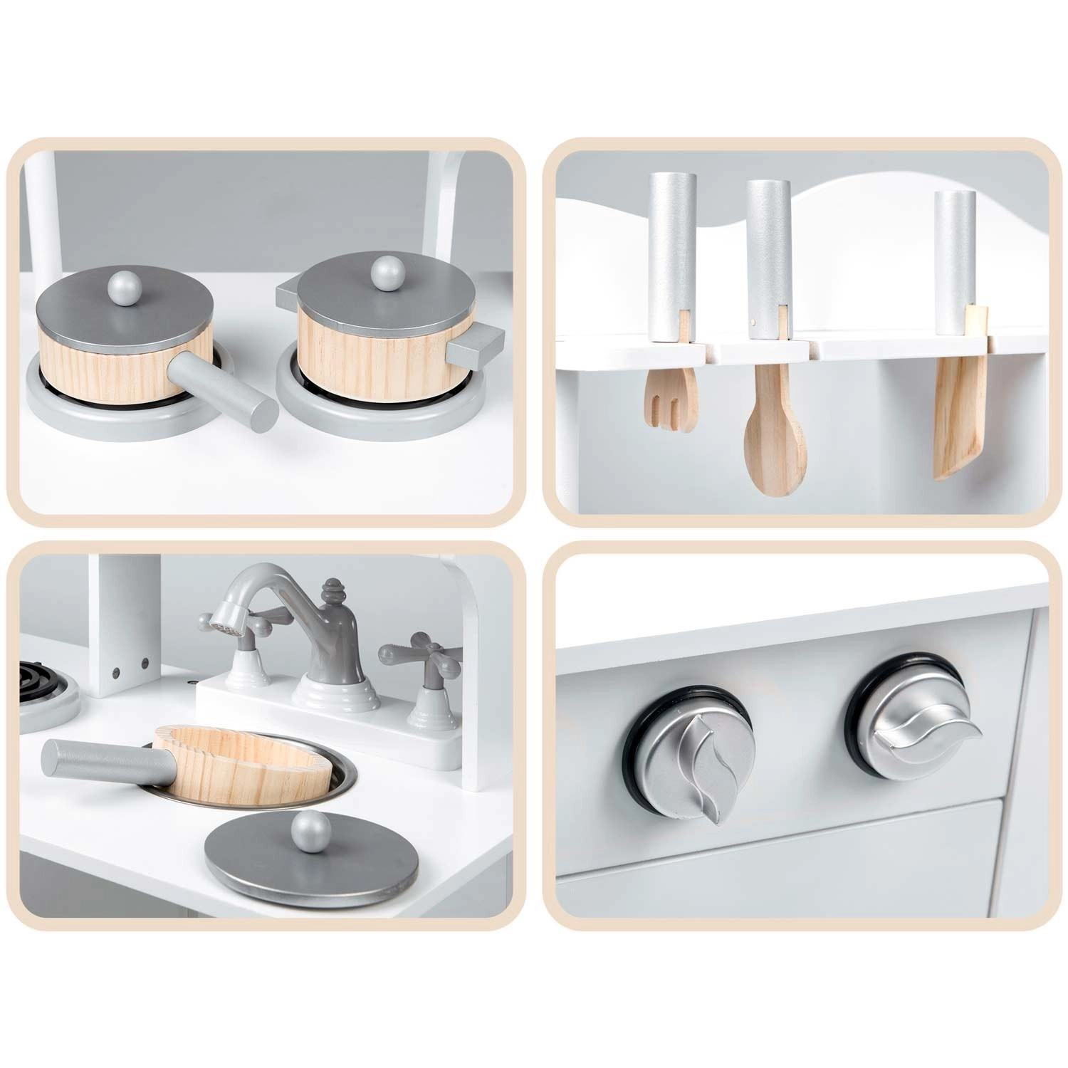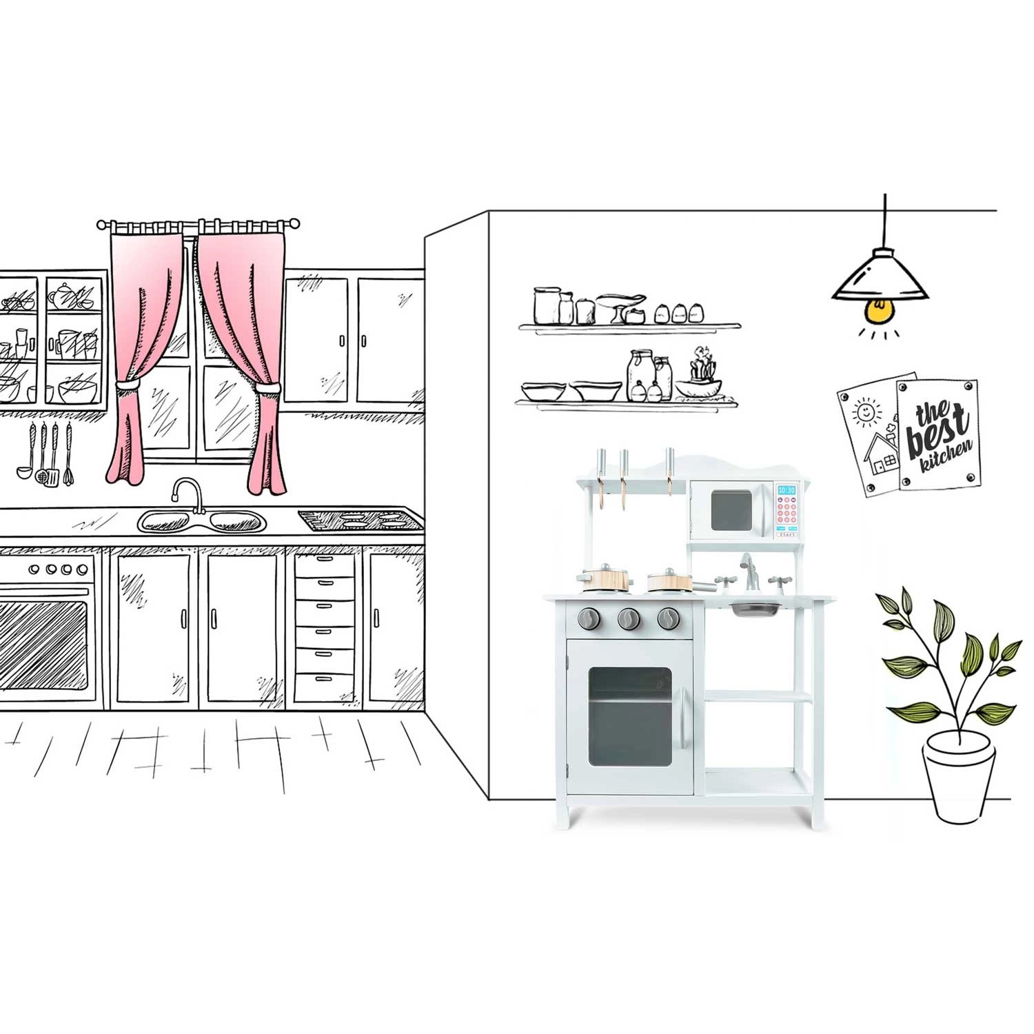 Découvrez une cuisine en bois pour enfants de qualité, dans une élégante couleur blanche, qui stimule l’imagination et le jeu créatif. Elle offre des boutons sensoriels rotatifs, un micro-ondes avec panneau coloré, un évier amovible avec robinet et des portes à fermeture magnétique. Sont inclus des casseroles et des ustensiles – tout pour des heures de jeu sûr et amusant.