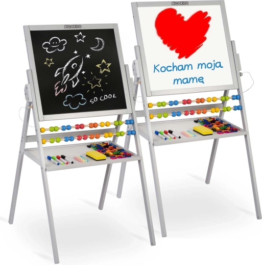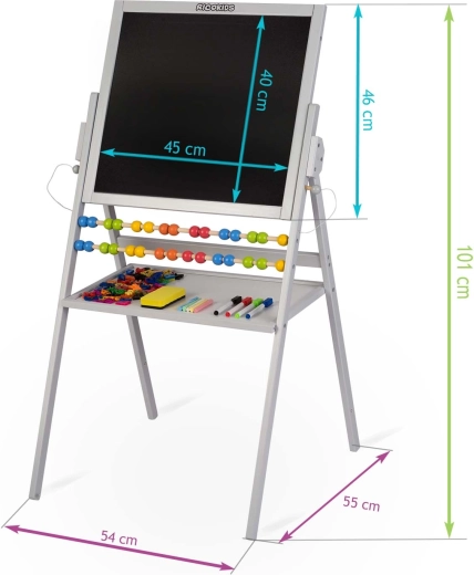 Le tableau double face RICOKIDS est un outil idéal pour un apprentissage créatif à la maison comme à la maternelle. Un côté est magnétique pour travailler avec des aimants et des feutres, l’autre est pour la craie afin de dessiner de manière classique. Il comprend également un boulier, qui soutient de façon ludique les premiers pas en mathématiques.